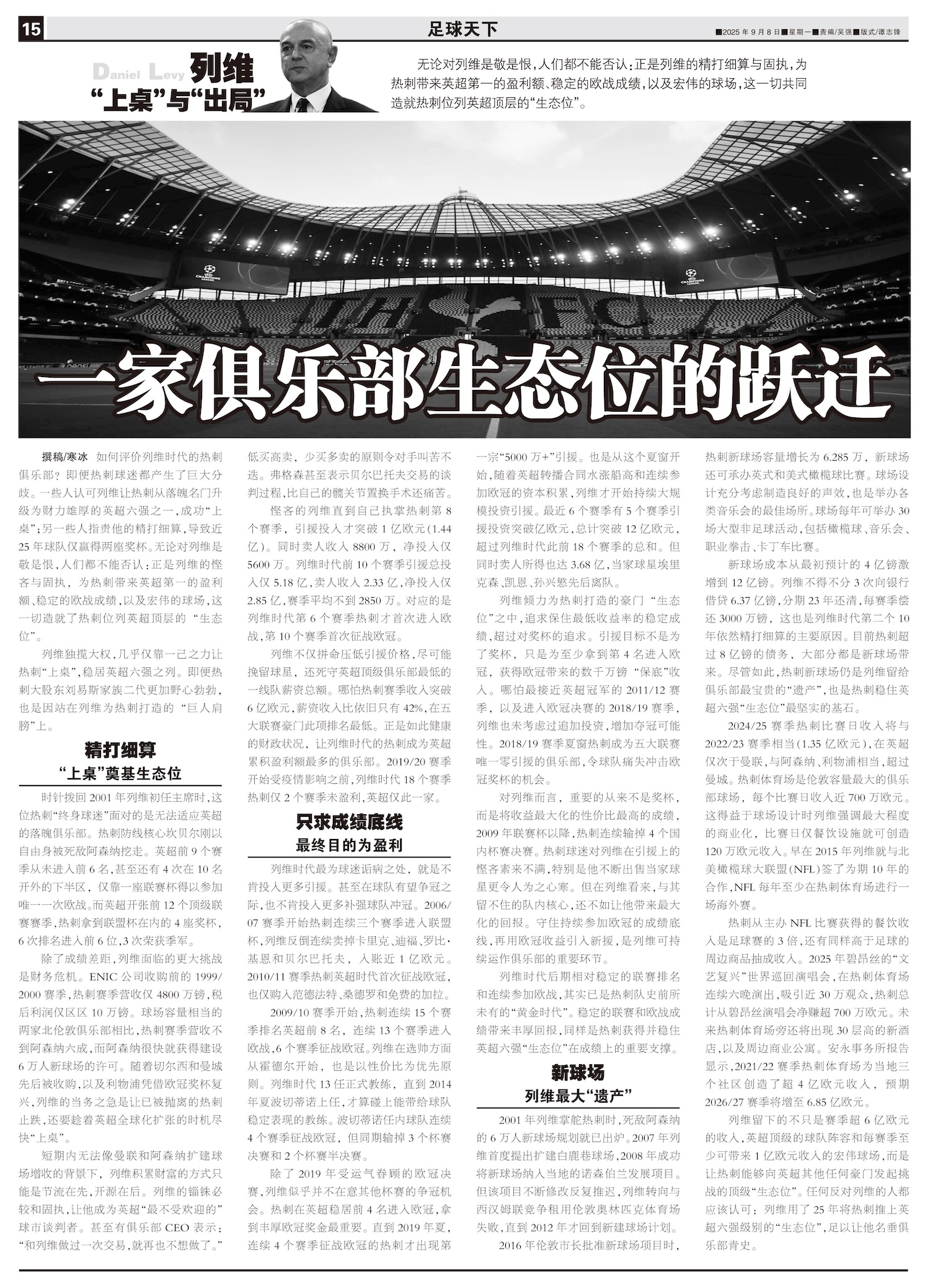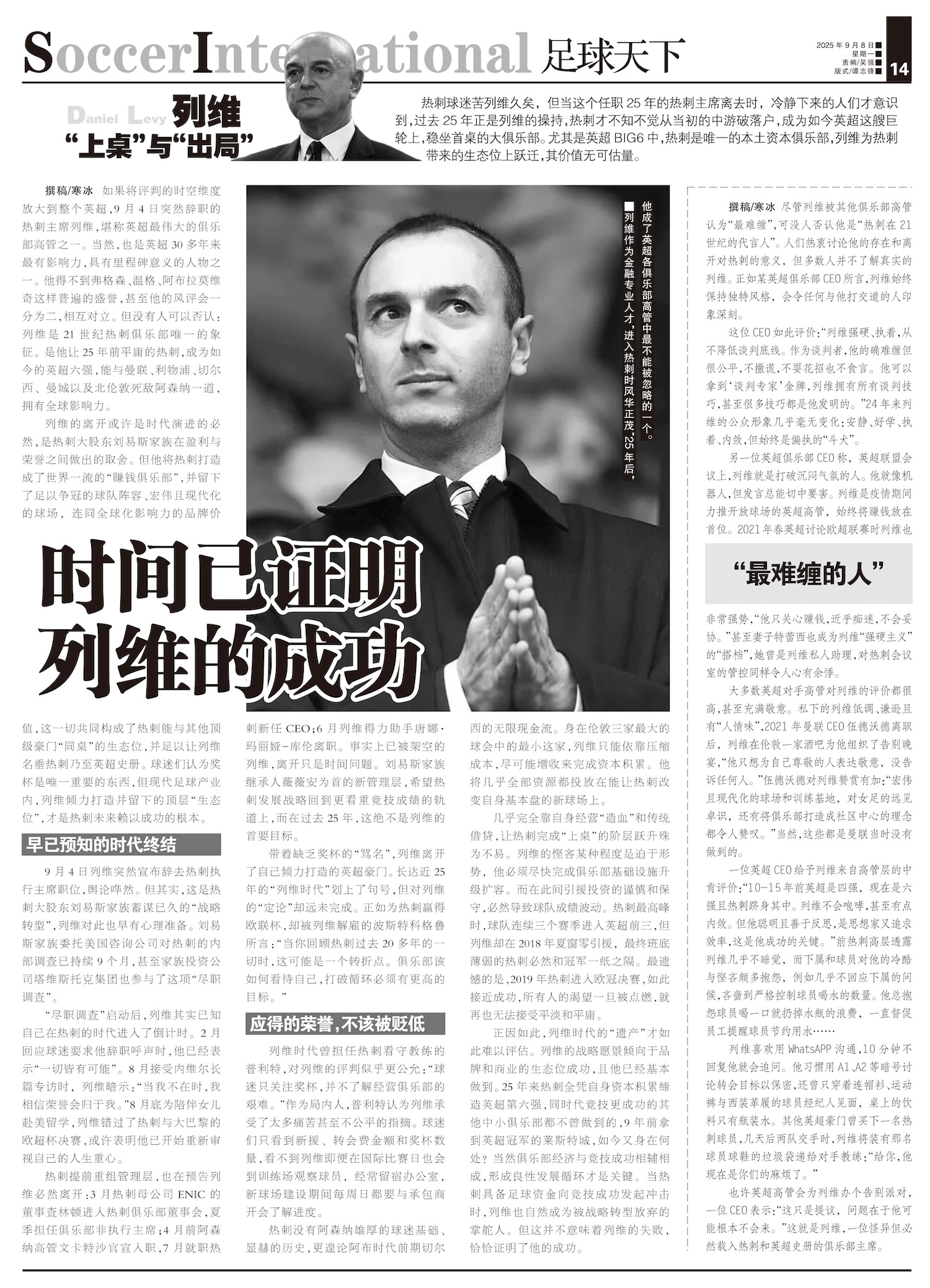 尽管列维被其他俱乐部高管认为“最难缠”,可没人否认他是“热刺在21世纪的代言人”。人们热衷讨论他的存...