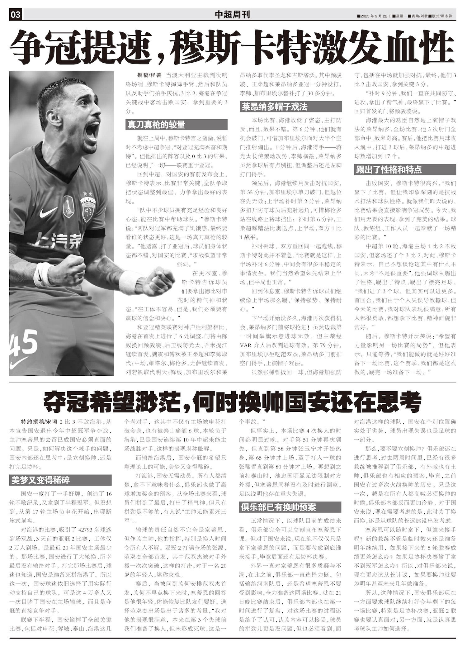 当澳大利亚主裁判吹响终场哨,穆斯卡特挥舞手臂,然后和队员以及助手们拍手庆祝,3比2,海港在争冠关键战...