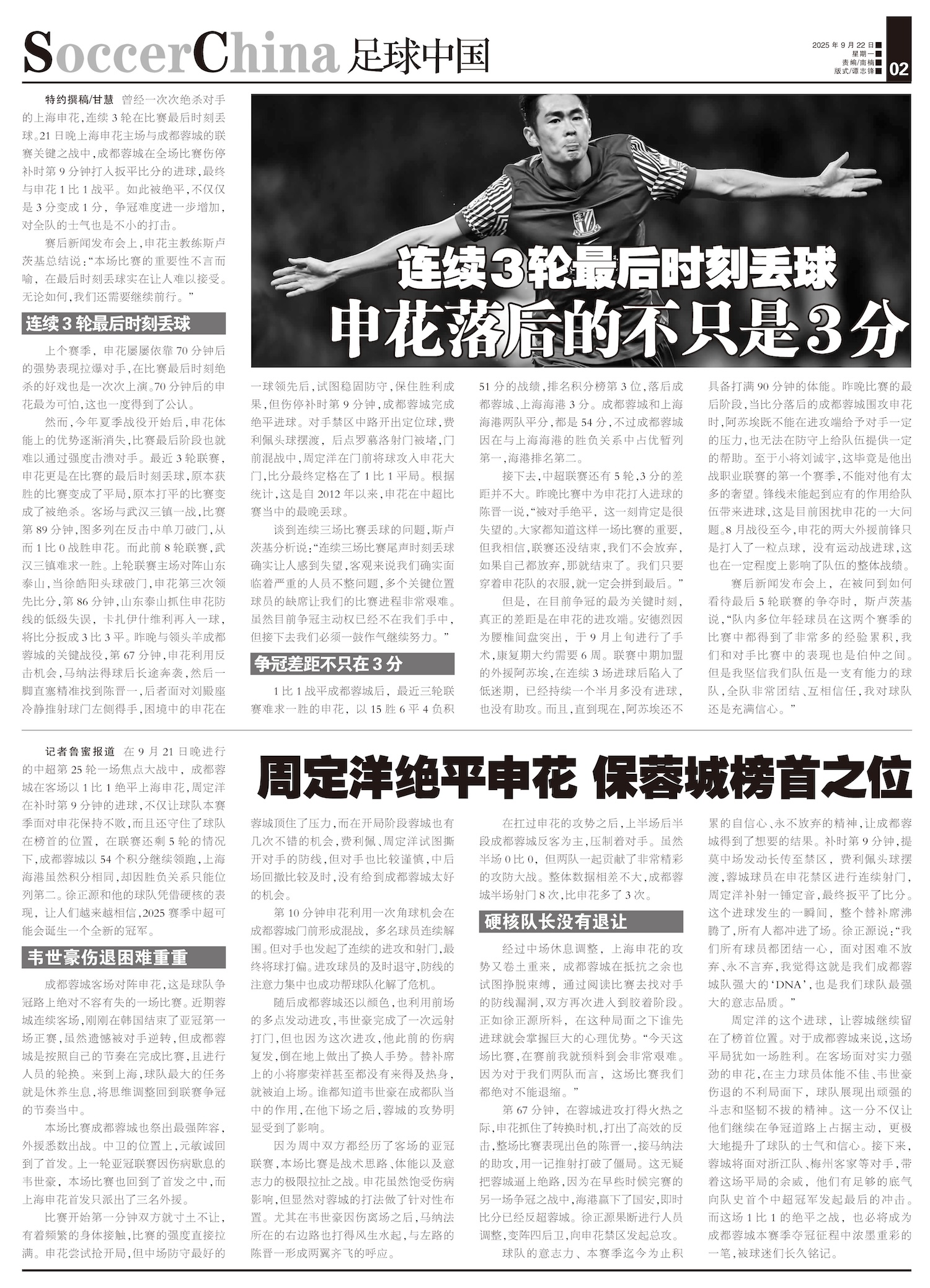 周定洋绝平申花 保蓉城榜首之位