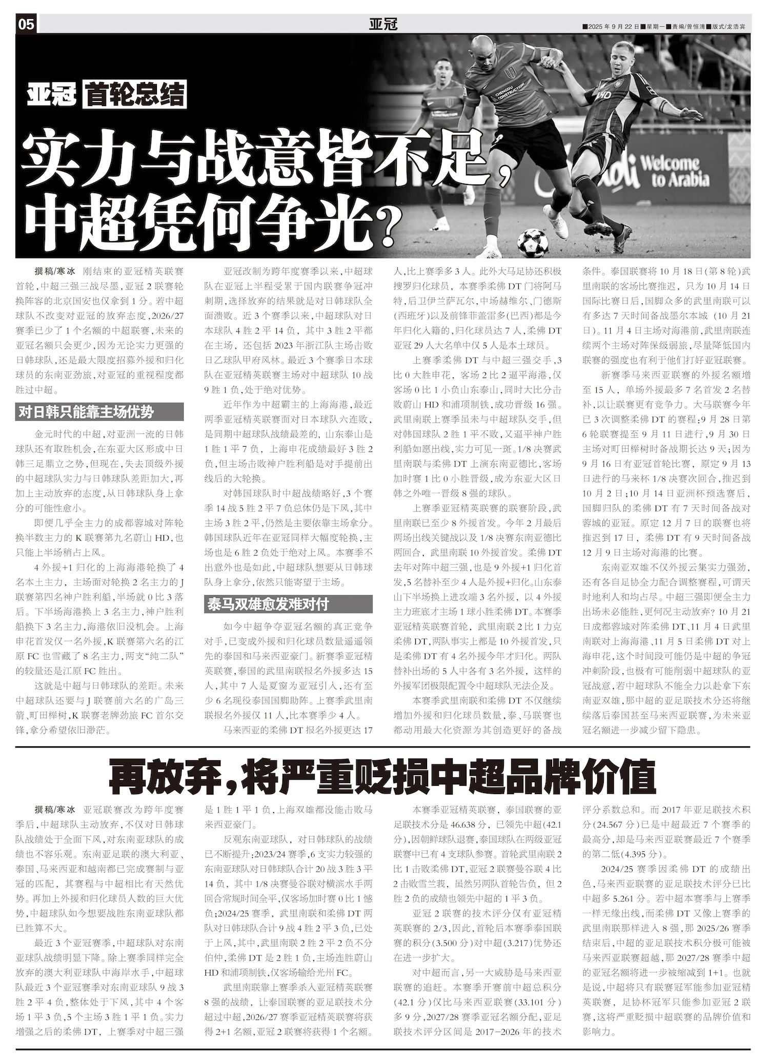 刚结束的亚冠精英联赛首轮,中超三强三战尽墨,亚冠2联赛轮换阵容的北京国安也仅拿到1分。若中超球队不改...