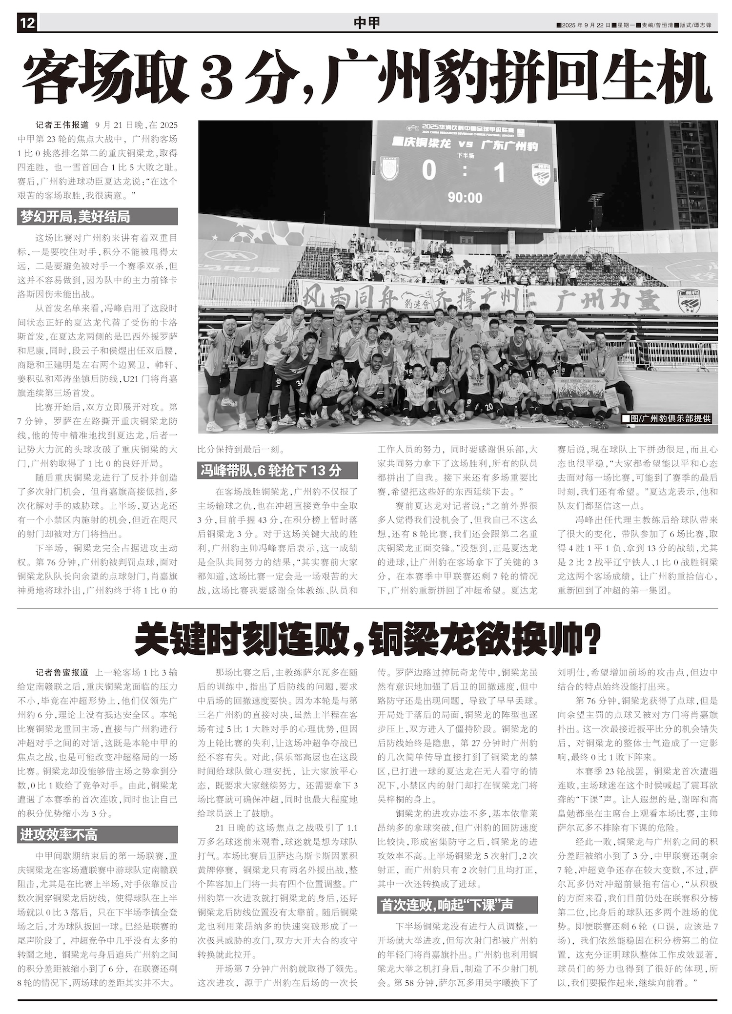 9月21日晚,在2025中甲第23轮的焦点大战中,广州豹客场1比0挑落排名第二的重庆铜梁龙,取得四连...