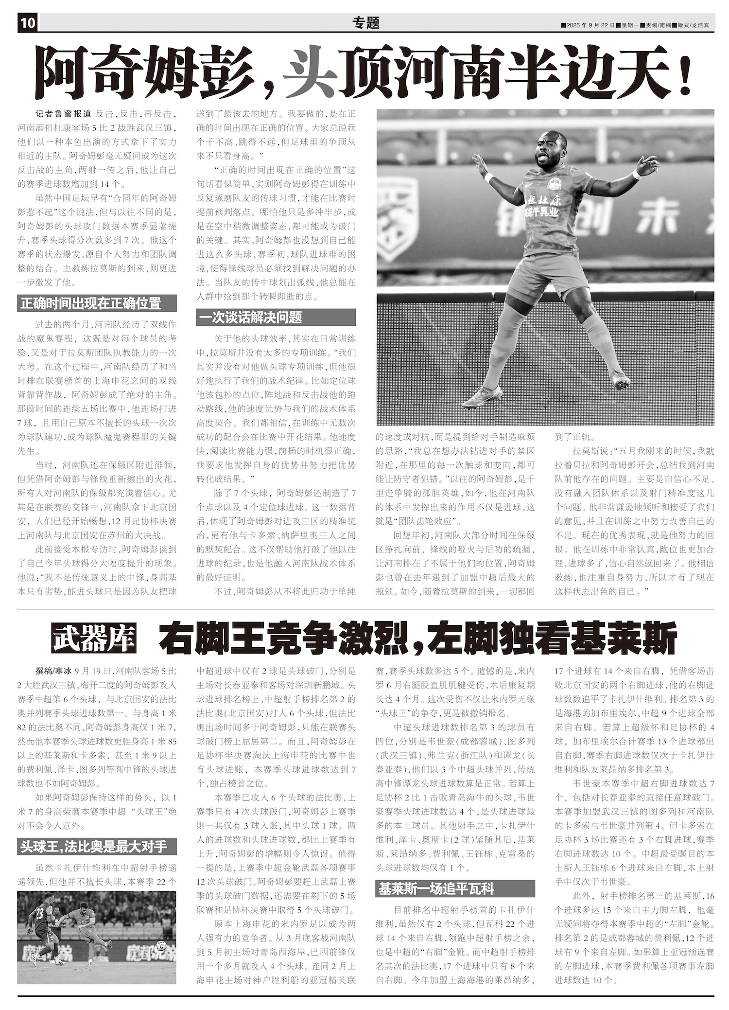 9月19日,河南队客场5比2大胜武汉三镇,梅开二度的阿奇姆彭攻入赛季中超第6个头球,与北京国安的法比...
