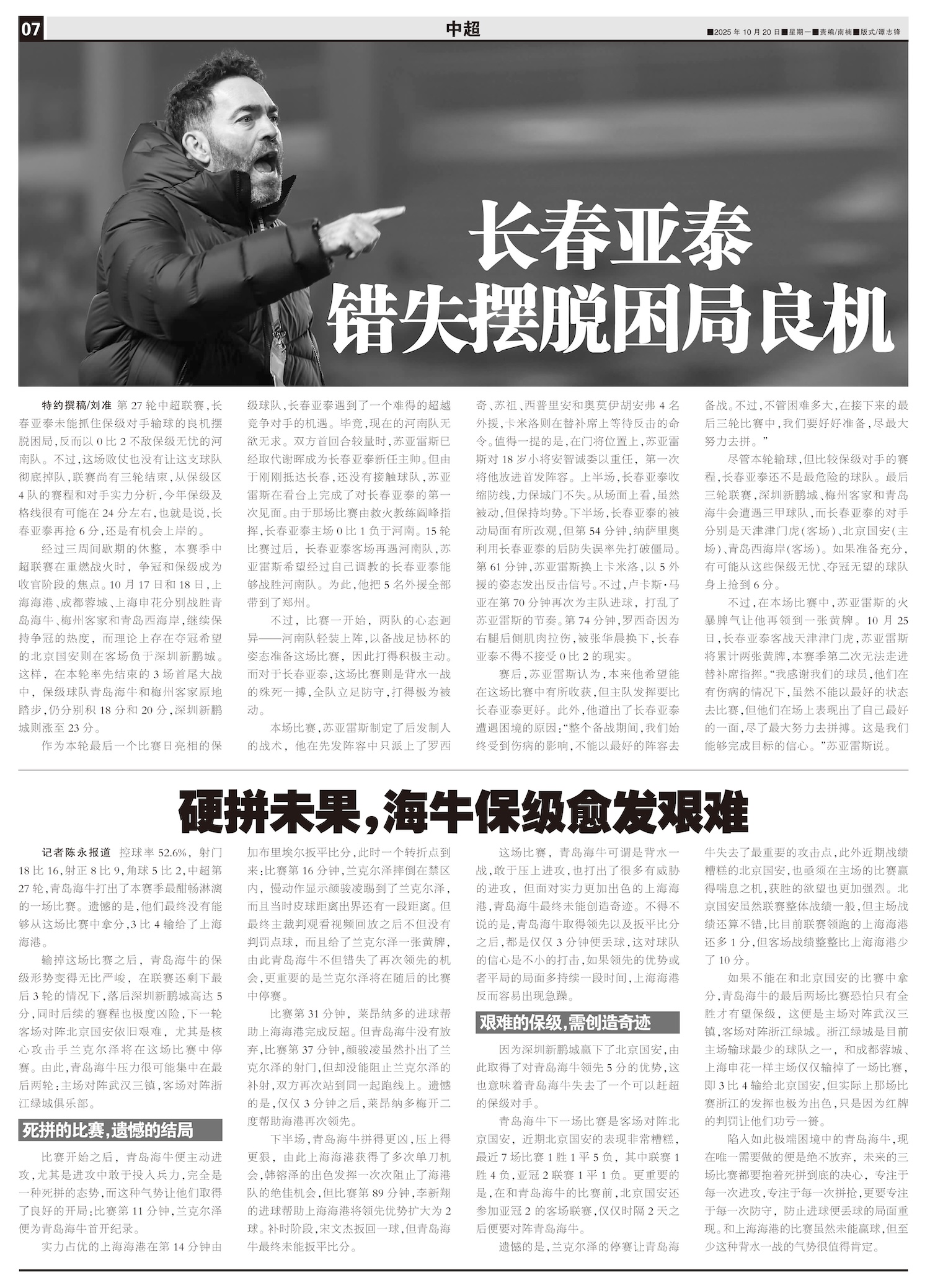 第27轮中超联赛,长春亚泰未能抓住保级对手输球的良机摆脱困局,反而以0比2不敌保级无忧的河南队。不过...