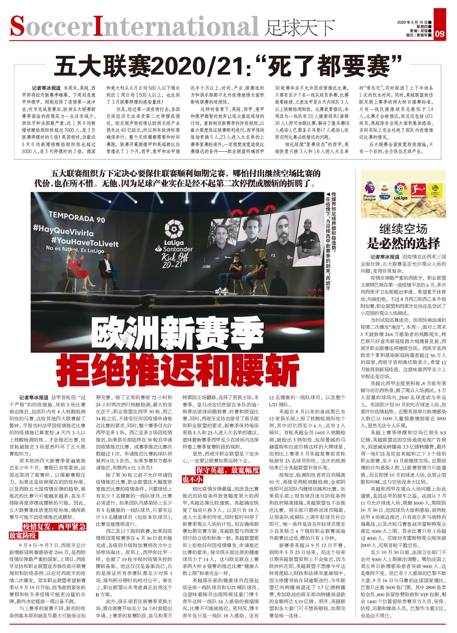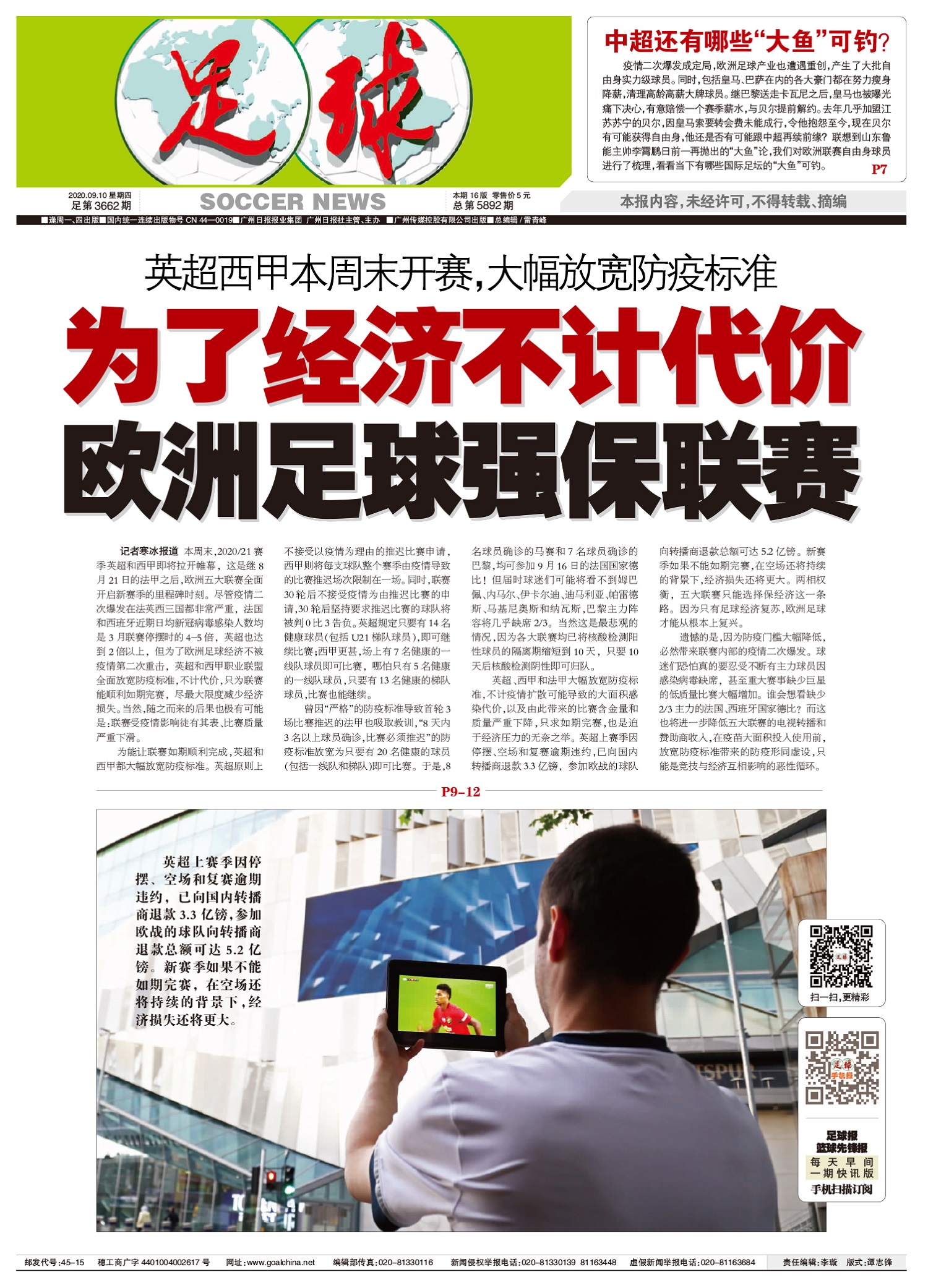 【封面报道】为了经济不计代价,欧洲足球强保联赛;【要闻】摩托一响,恒大霸榜;扛起申花的,还是莫队;【专题】重生,武磊从马尔贝拉出发;【足球天下】死命令:2020-21赛季,一场都不能少!;