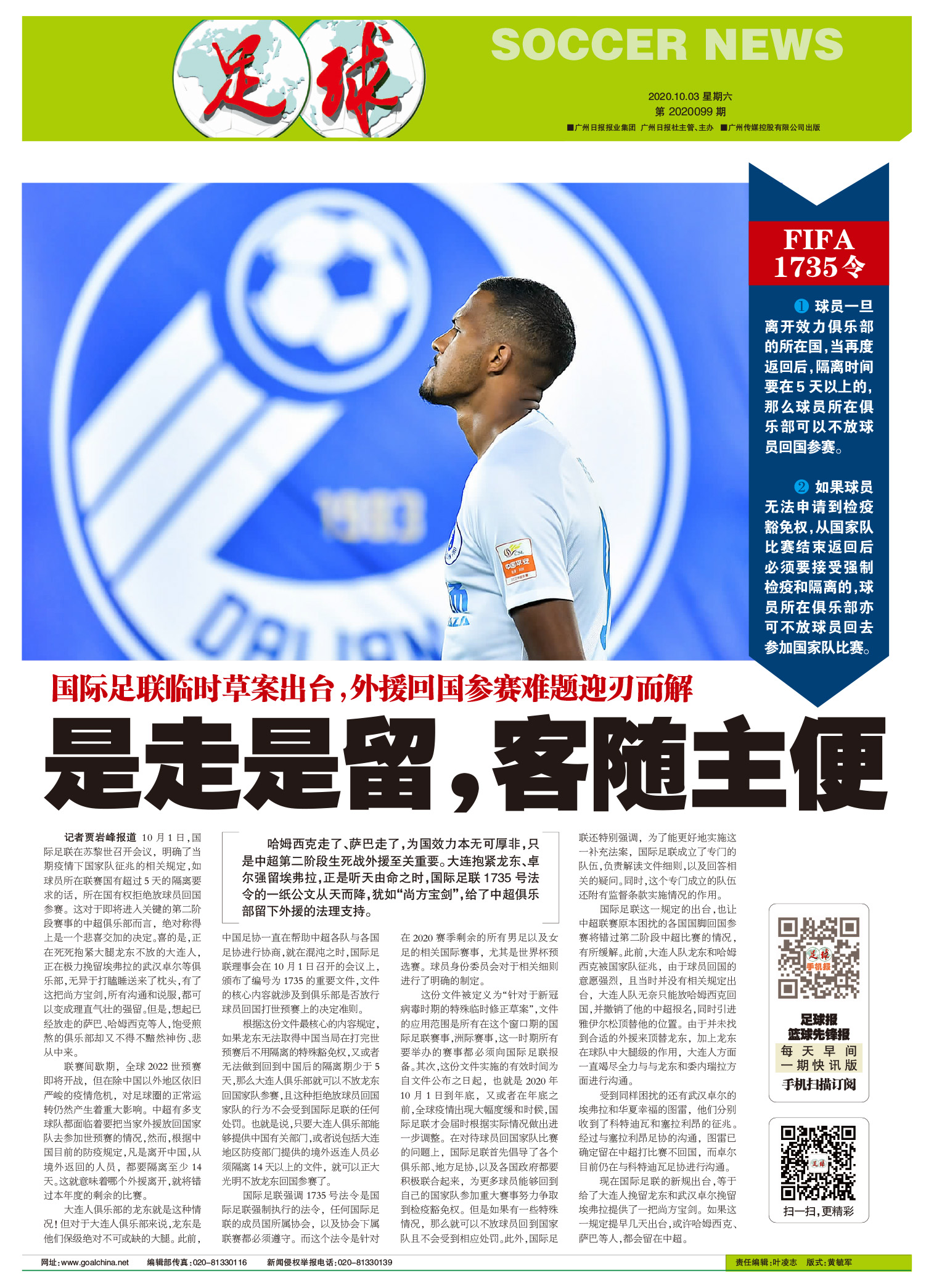 【封面报道】国际足联临时草案出台,外援回国参赛难题迎刃而解。是走是留,客随主便;【要闻】一封征调令牵动武汉的心;【专题】德托马斯去留是关键;【足球天下】以一敌九;