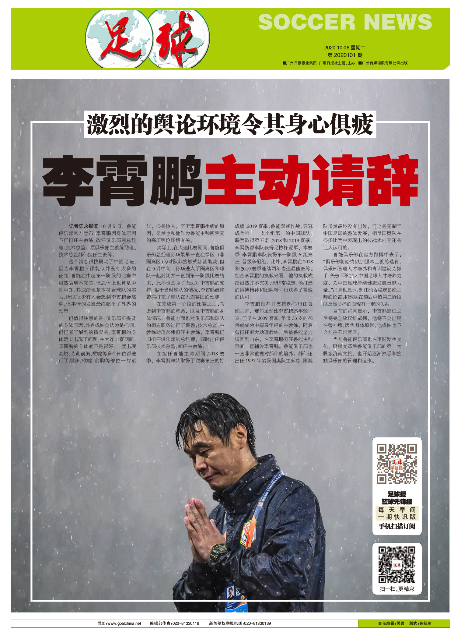 【封面报道】激烈的舆论环境令其身心俱疲。李霄鹏主动请辞;【要闻】亚冠 VS 足协杯,BIG4的选择;【专题】落选国脚谭龙7轮6球。中甲射手王告白国足;【足球天下】克伦克继续丧心病狂。解雇吉祥物!;