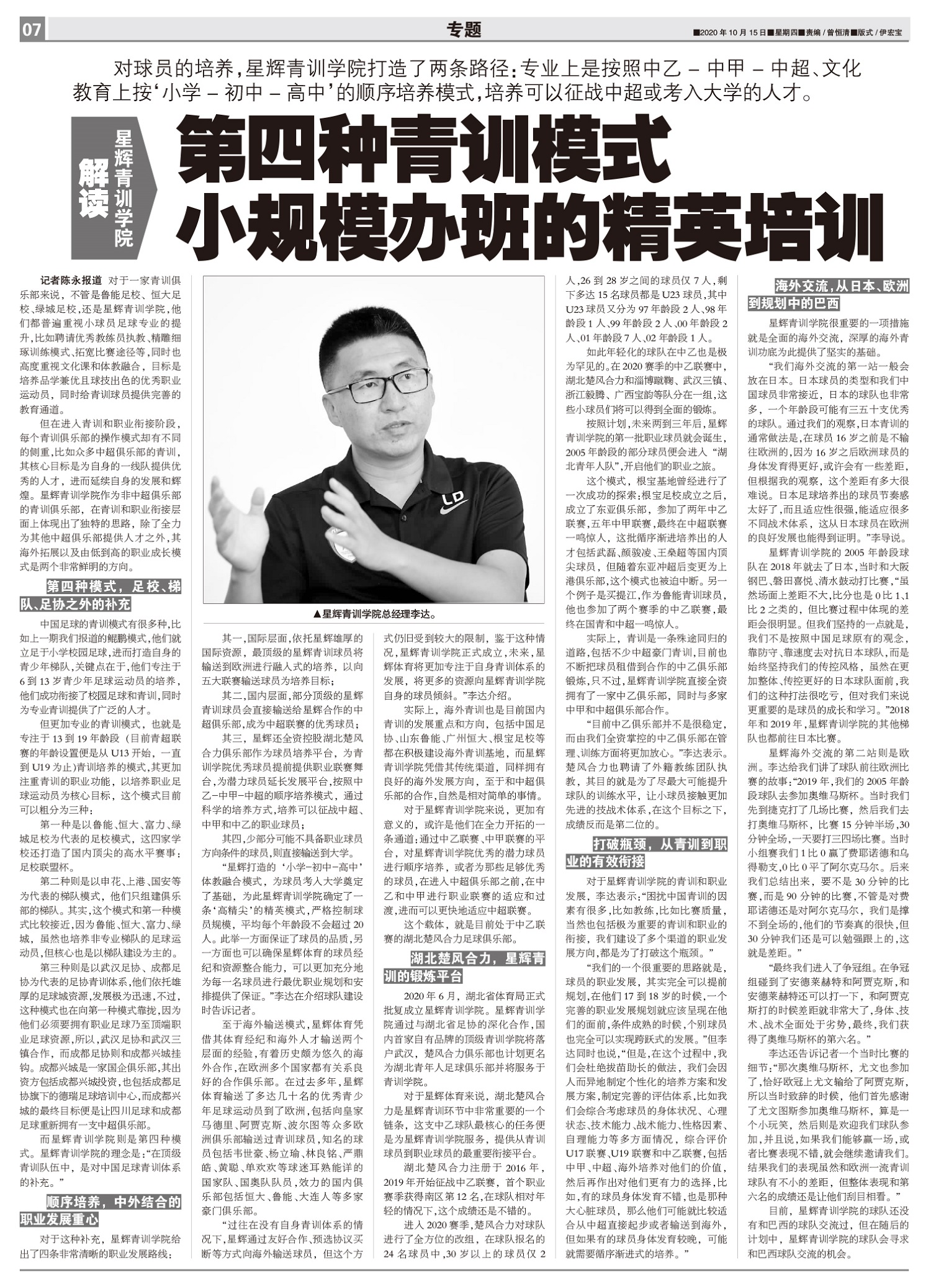 对球员的培养,星辉青训学院打造了两条路径:专业上是按照中乙-中甲-中超、文化教育上按‘小学-初中-高...