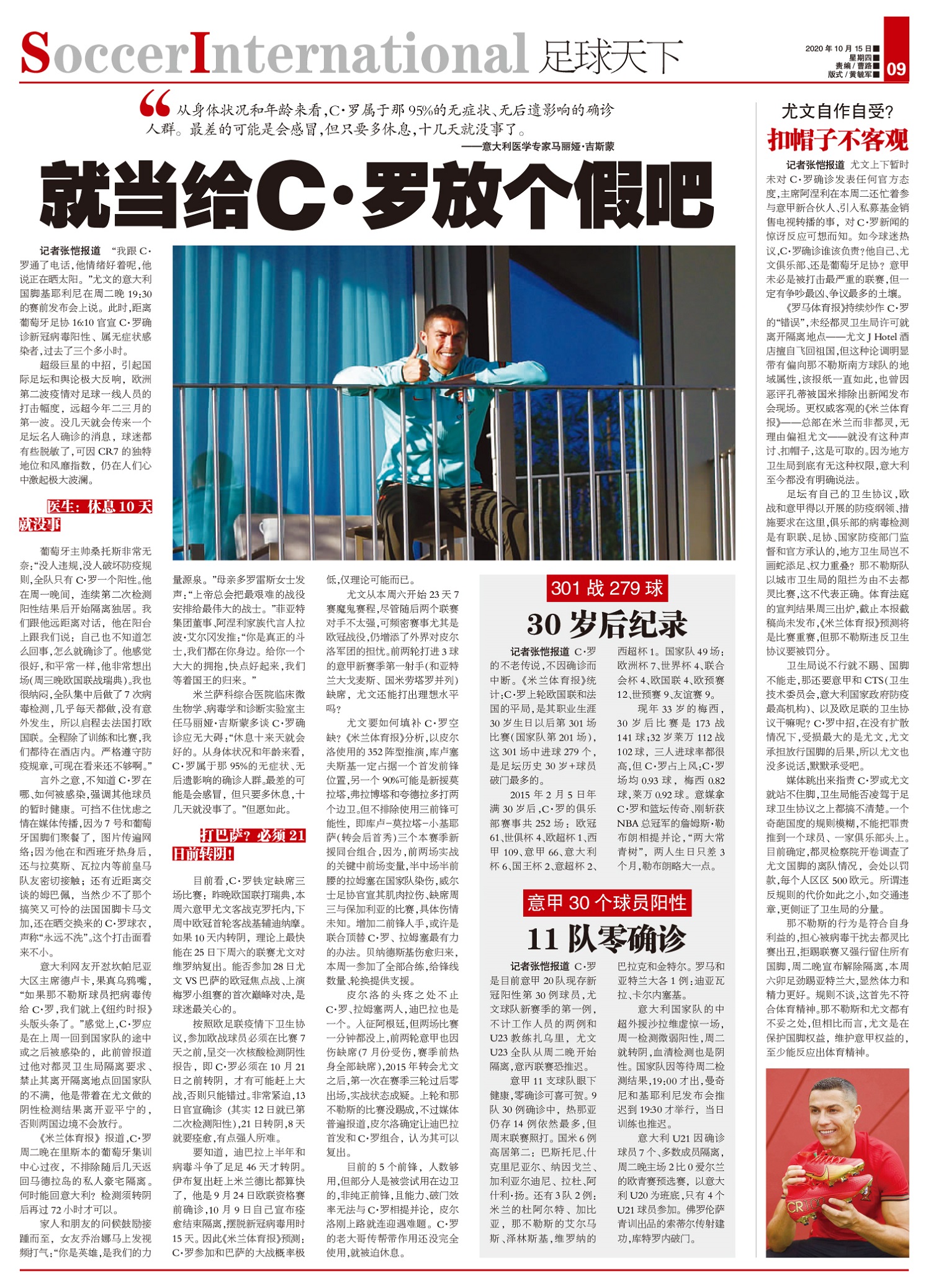 C·罗是目前意甲20队现存新冠阳性第30例球员,尤文球队新赛季的第一例,不计工作人员的两例和U23教...