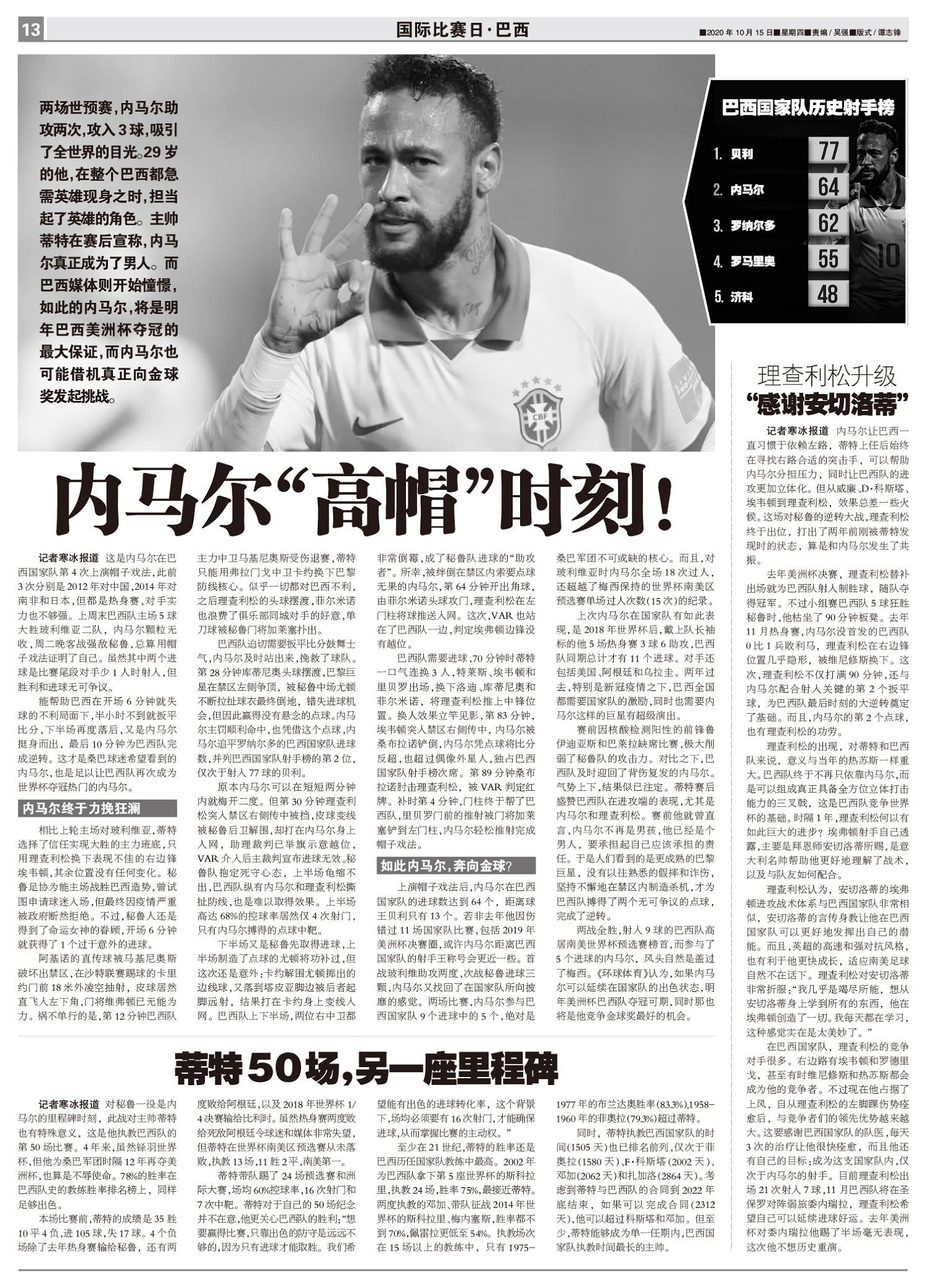 对秘鲁一役是内马尔的里程碑时刻,此战对主帅蒂特也有特殊意义,这是他执教巴西队的第50场比赛。4年来...