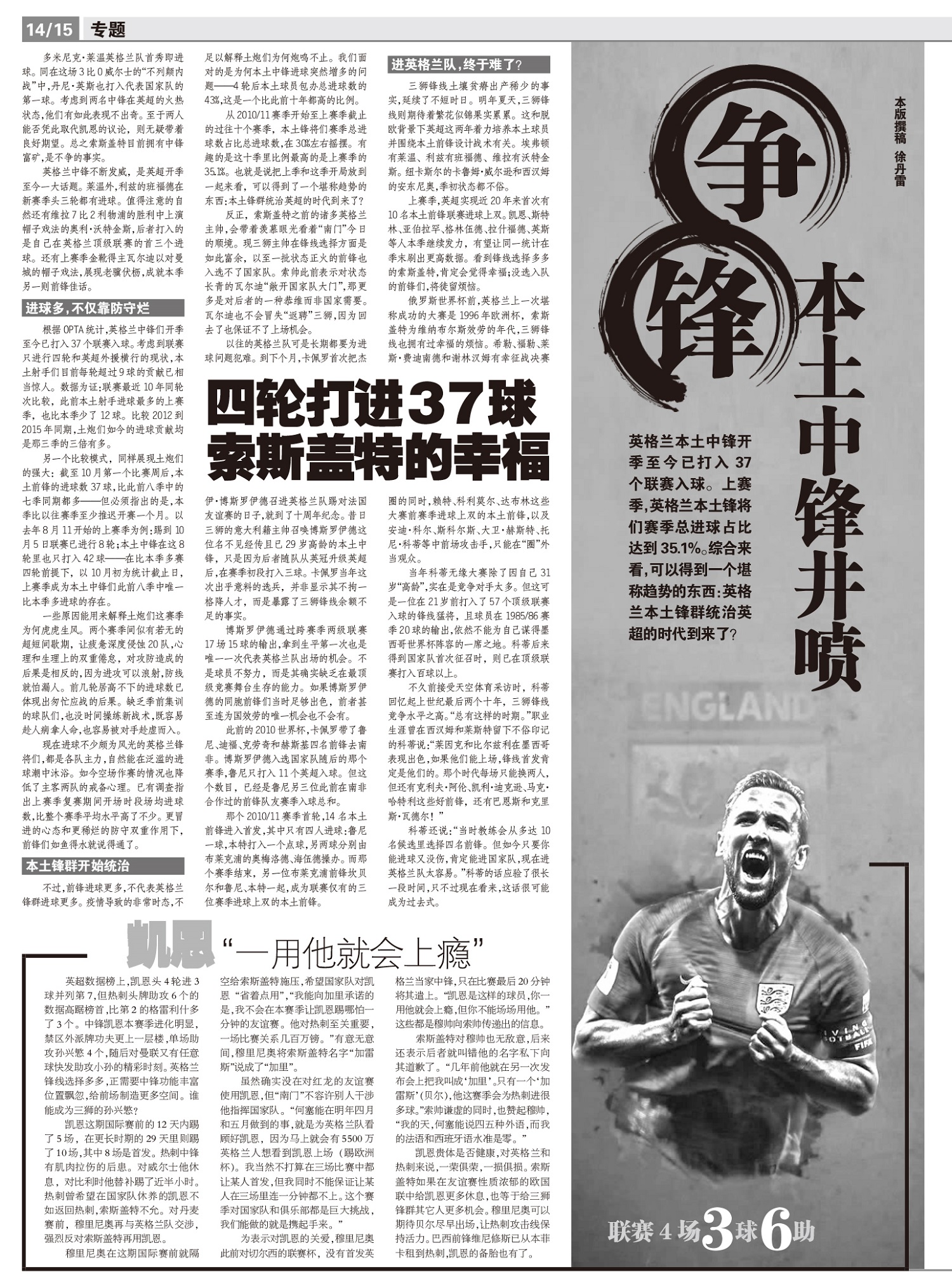 英格兰本土中锋开季至今已打入37个联赛入球。上赛季,英格兰本土锋将们赛季总进球占比达到35.1%。综...