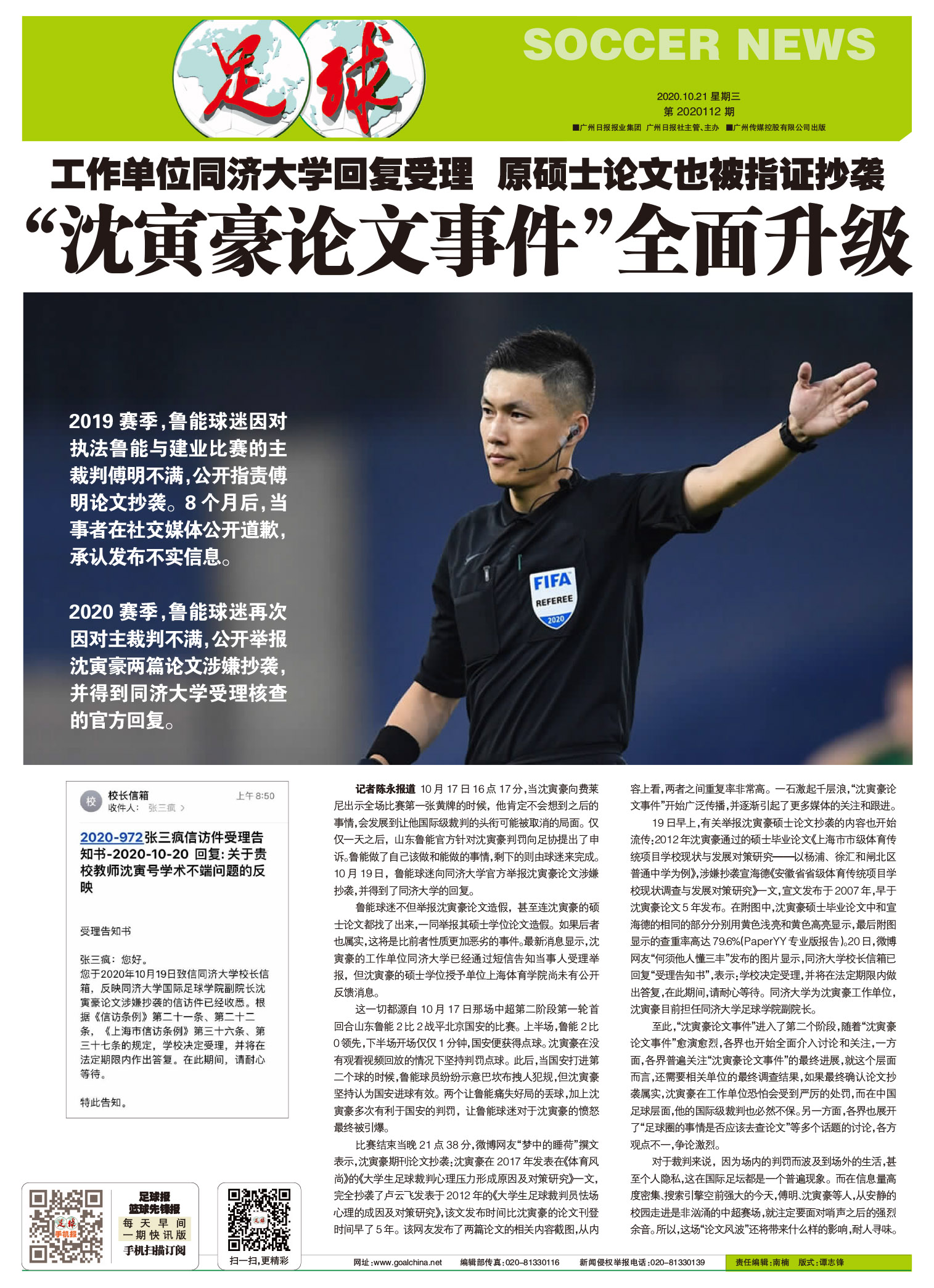【封面报道】“沈寅豪论文事件”全面升级;【要闻】三转引援检测报告临时抱佛脚有用吗?;【专题】恒大怕什么,就越来什么;【足球天下】5.75亿欧元巨额损失引发改革;