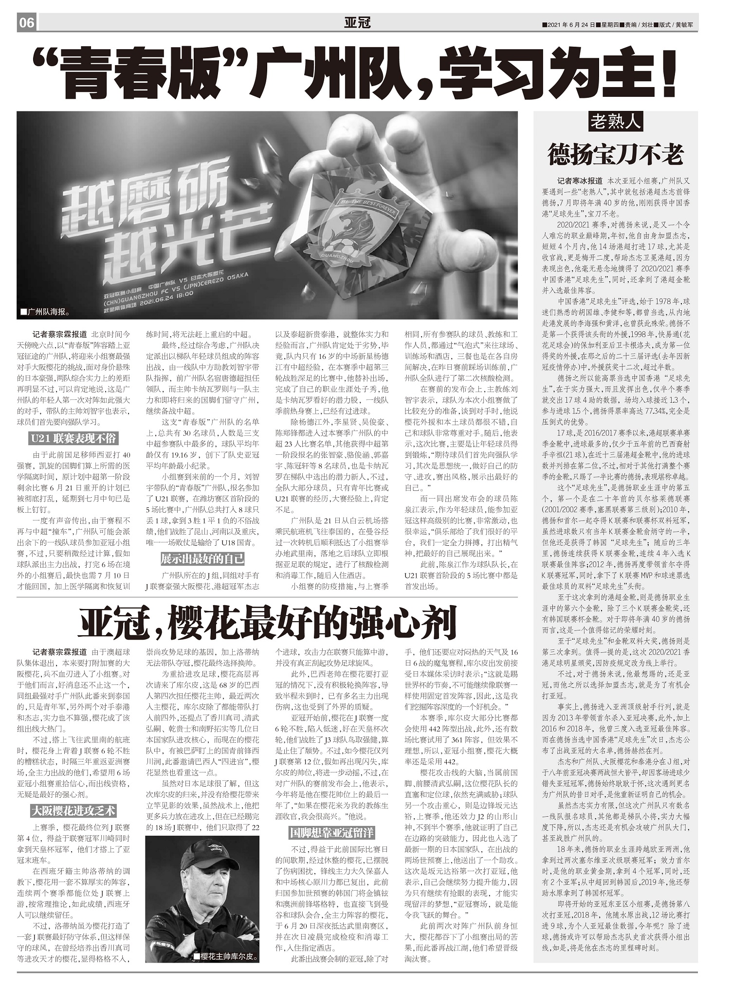 北京时间今天傍晚六点,以“青春版”阵容踏上亚冠征途的广州队,将迎来小组赛最强对手大阪樱花的挑战,面对...