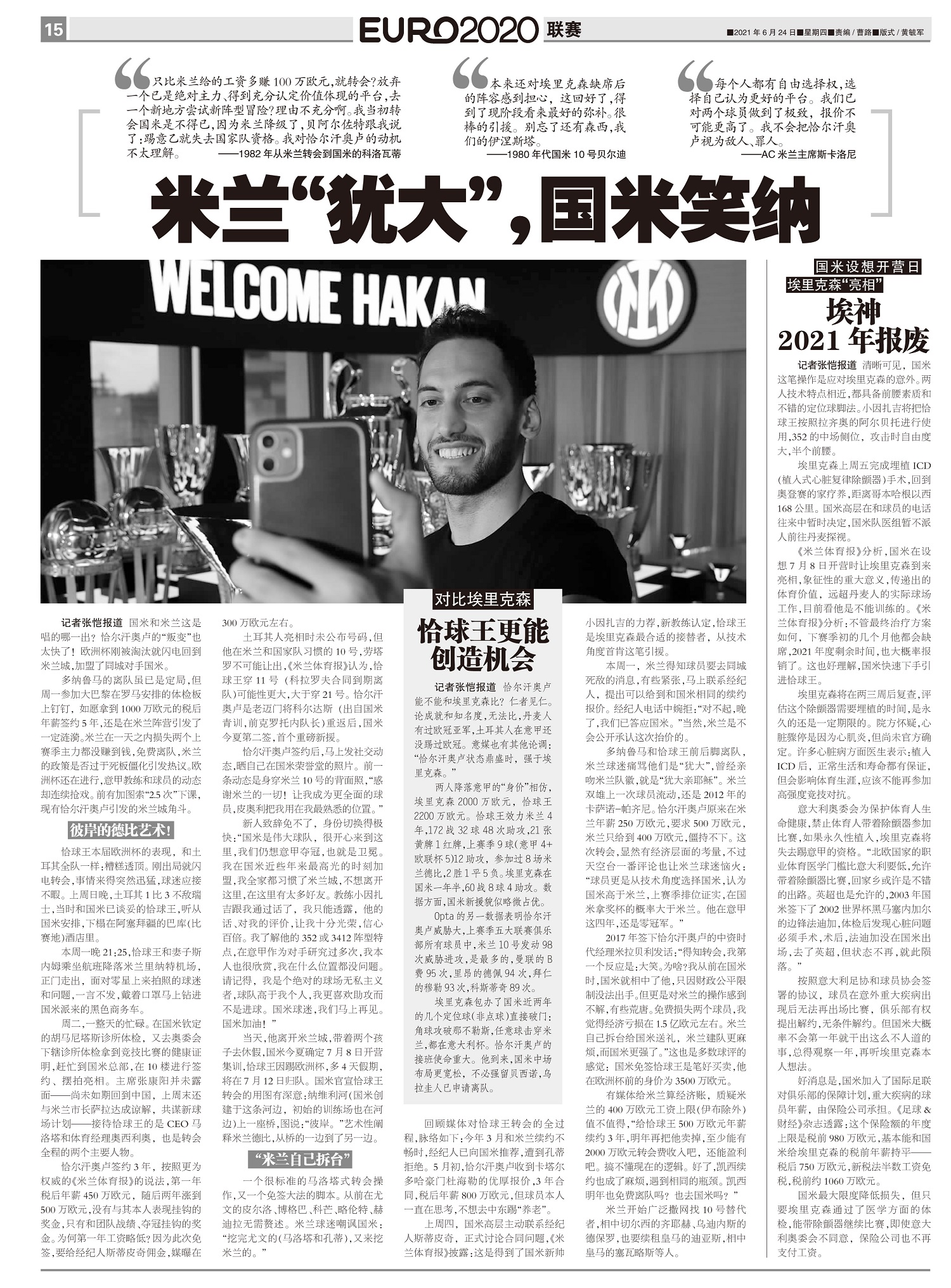 恰尔汗奥卢能不能和埃里克森比?仁者见仁。论成就和知名度,无法比,丹麦人有过欧冠亚军,土耳其人在意甲还...