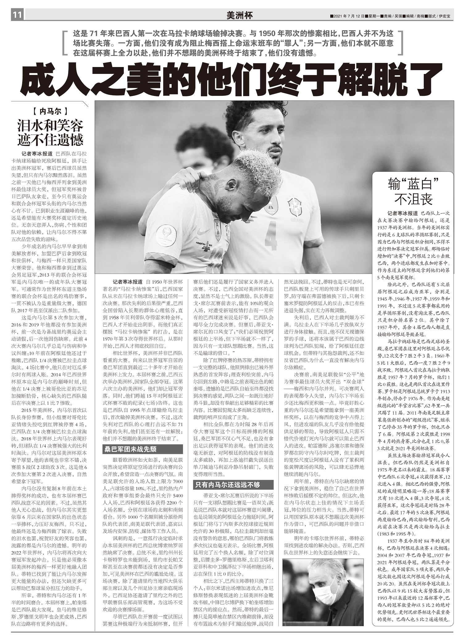 巴西队在马拉卡纳球场输给死敌阿根廷,拱手让出美洲杯冠军,赛后巴西球员虽然失望,但只有内马尔黯然落泪。...