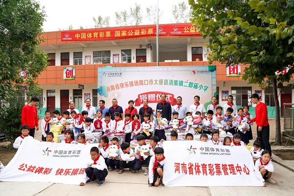 “加油!加油呀!”拉拉队的助威声响彻在周口市太康县清集镇二郎庙小学的上空。一场温暖的“公益体彩 快乐操场”捐赠仪式正在这里举行。操场上一派热闹的景象,羽毛球在同学间你来我往,篮球在男孩儿们手下前后左右地跳着,呼啦圈在女孩儿们的腰间不停的旋转……。