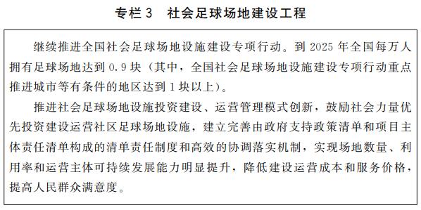 专栏3“社会足球场地建设工程”中,要继续推进全国社会足球场地设施建设专项行动,到2025年全国每万人拥有足球场地达到0.9块,其中,全国社会足球场地设施建设专项行动重点推进城市等有条件的地区达到1块以上。