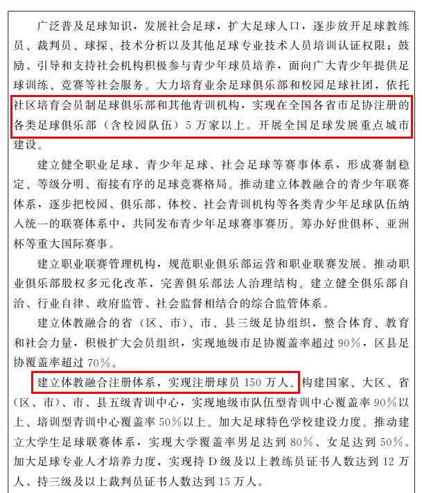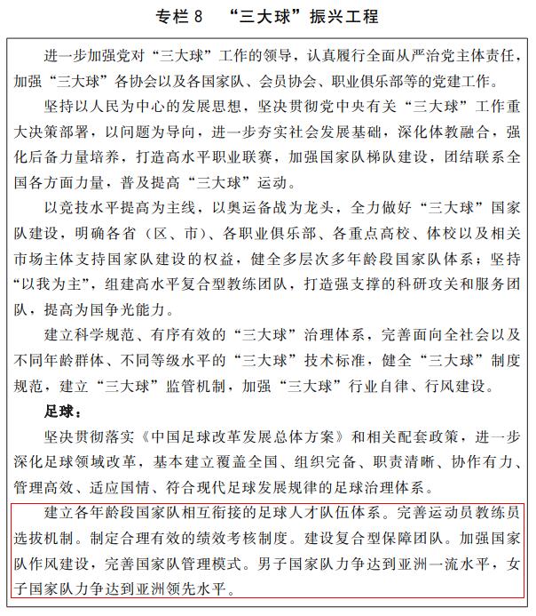 《规划》专栏8“‘三大球’振兴工程”中,涉及的足球内容比较系统,包括足球改革、队伍建设、足球人口、职业足球体系、体教融合、专业人才培养等多个方面。而其中的一些内容发布后,也引发了外界的热议。