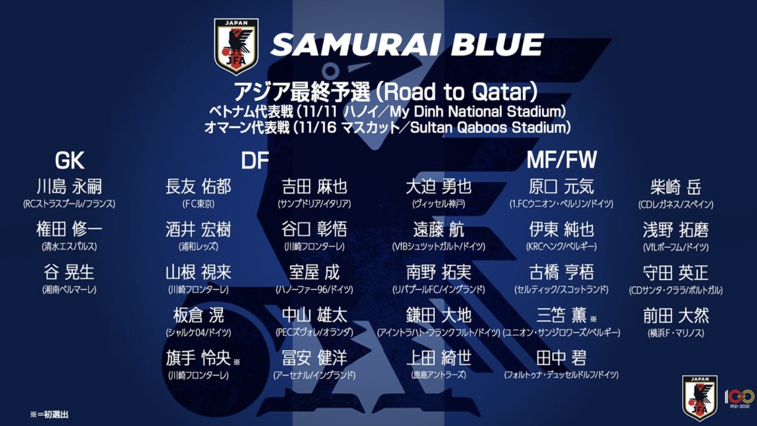 板仓滉、田中碧和三笘薰都是今夏才离开川崎前锋留洋。三笘薰与英超的布莱顿签约4年,但因劳工证问题被租借到比甲的圣吉罗斯联。11月名单最大的惊喜就是这位去年才完成J1联赛首秀的边路好手,上赛季他在J1联赛有10球入账,今夏转投比甲联赛,10月中旬首次进球就上演帽子戏法,立刻进入了森保一的视野。三笘薰入围,有伤在身的堂安律和久保健英都只能继续落选。