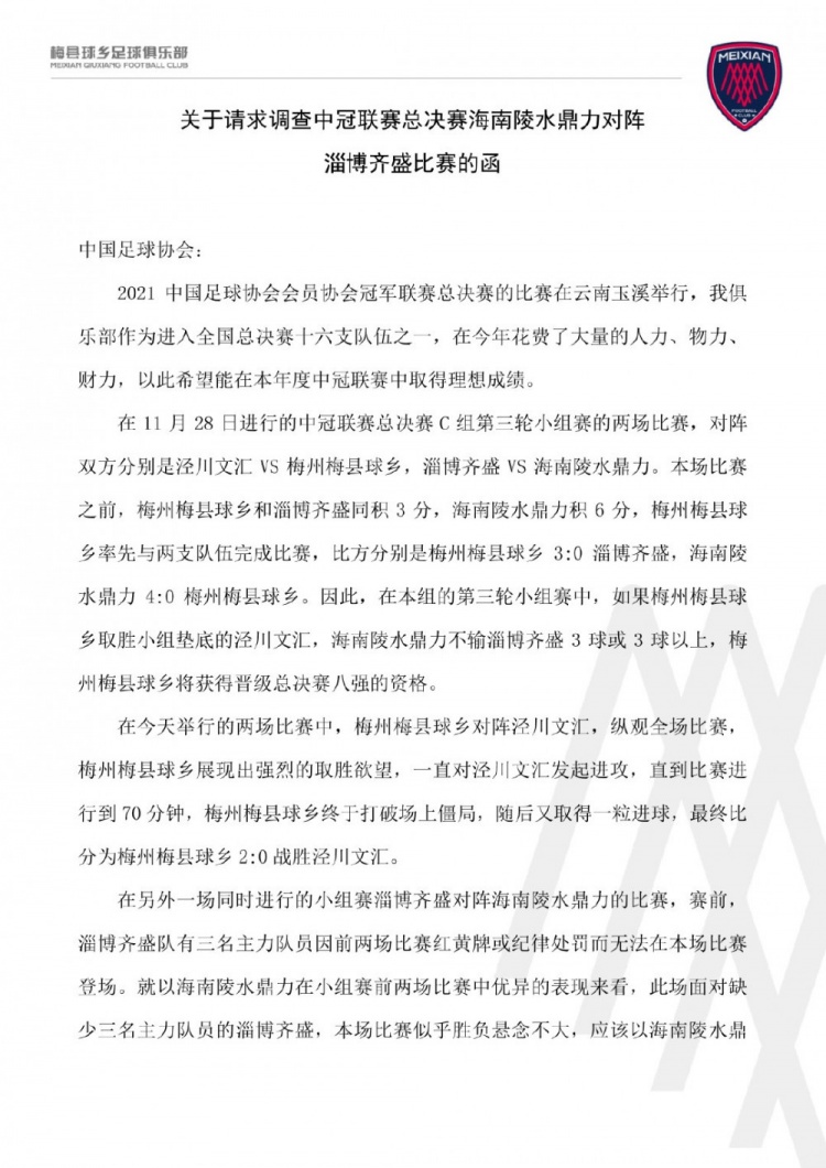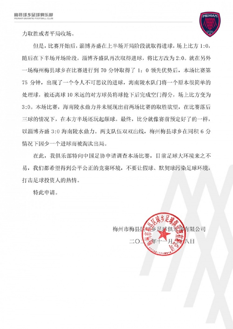 梅州梅县球乡俱乐部在函件上写道:“向中国足协申请调查本场比赛,目前足球大环境来之不易,我们都希望得到公平公正的竞赛环境,不要让假球、默契球污染足球环境,打击足球投资人的热情。”