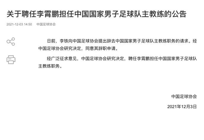 国足换帅的消息其实不是秘密,外界一直在等待正式公布。12月3日下午,官宣终于来了,中国足协官网公告,李铁辞职,李霄鹏成为新任国足主帅。