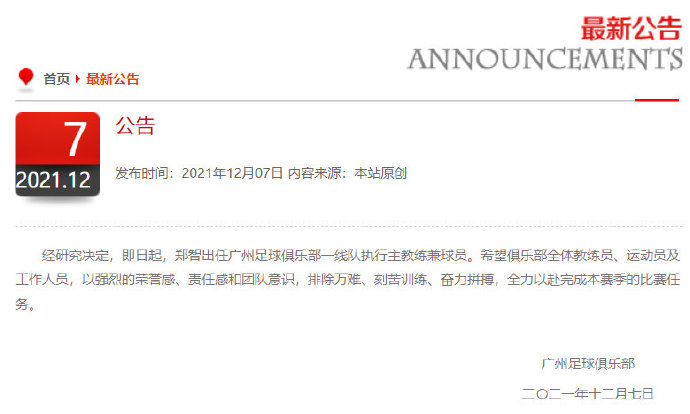 12月7日上午,广州足球俱乐部官方宣布:即日起,郑智出任广州足球俱乐部一线队执行主教练兼球员。