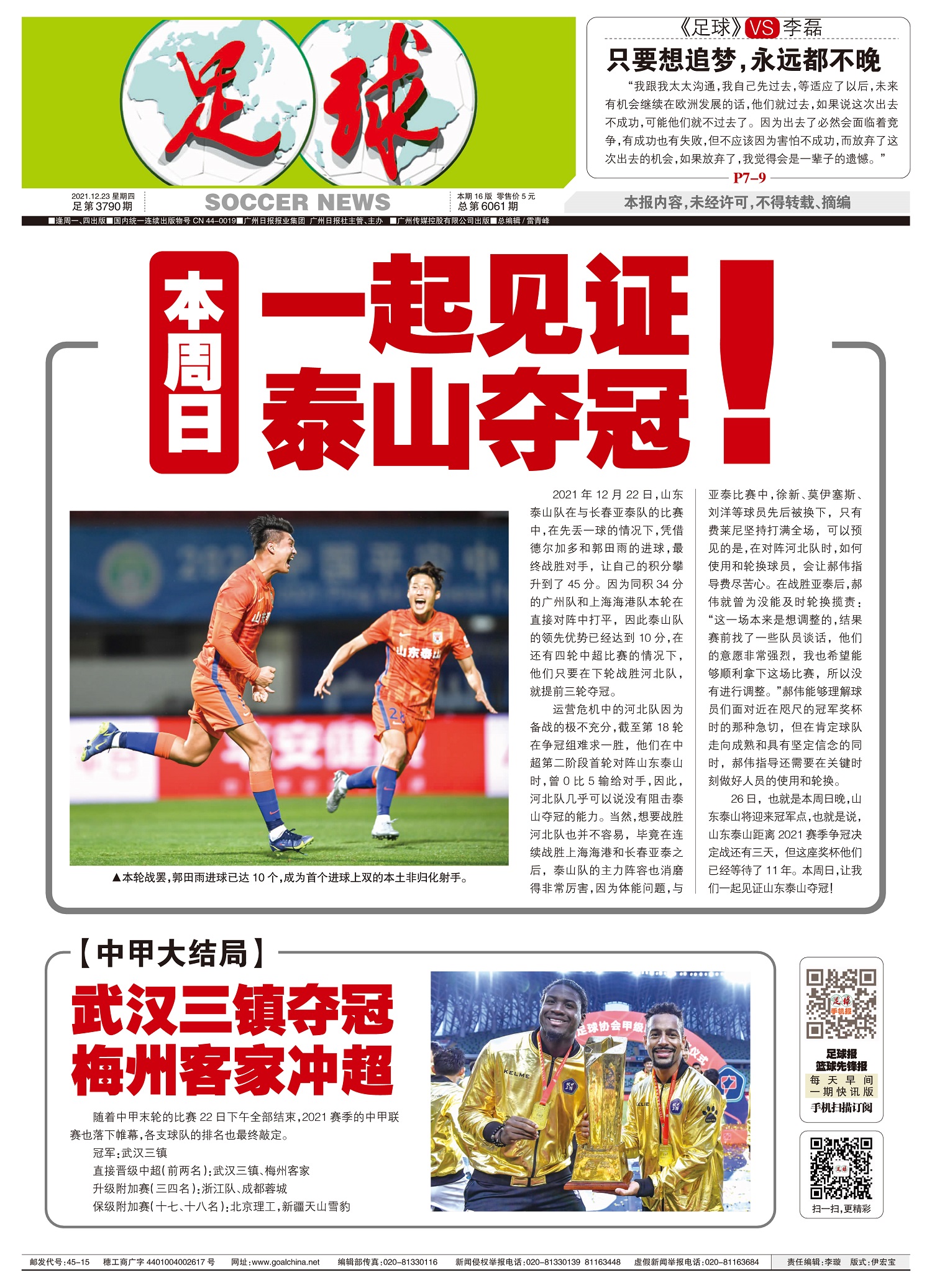 2021年12月22日,山东泰山队在与长春亚泰队的比赛中,在先丢一球的情况下,凭借德尔加多和郭田雨的...