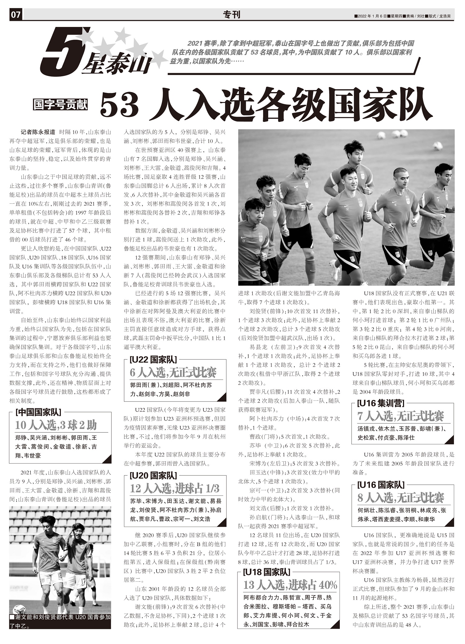 5星泰山2021赛季,除了拿到中超冠军,泰山在国字号上也做出了贡献,俱乐部为包括中国队在内的各级国家...