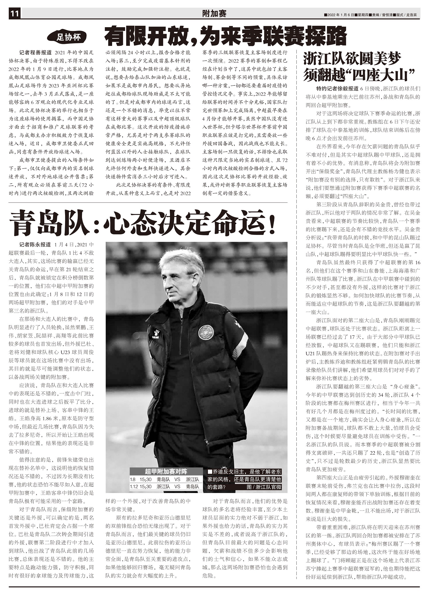 1月5日,中超中甲附加赛赛程官宣,浙江队与青岛队、大连人与成都蓉城,将分别在1月8日与1月12日进行...