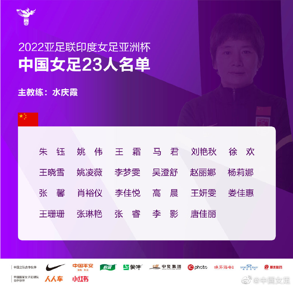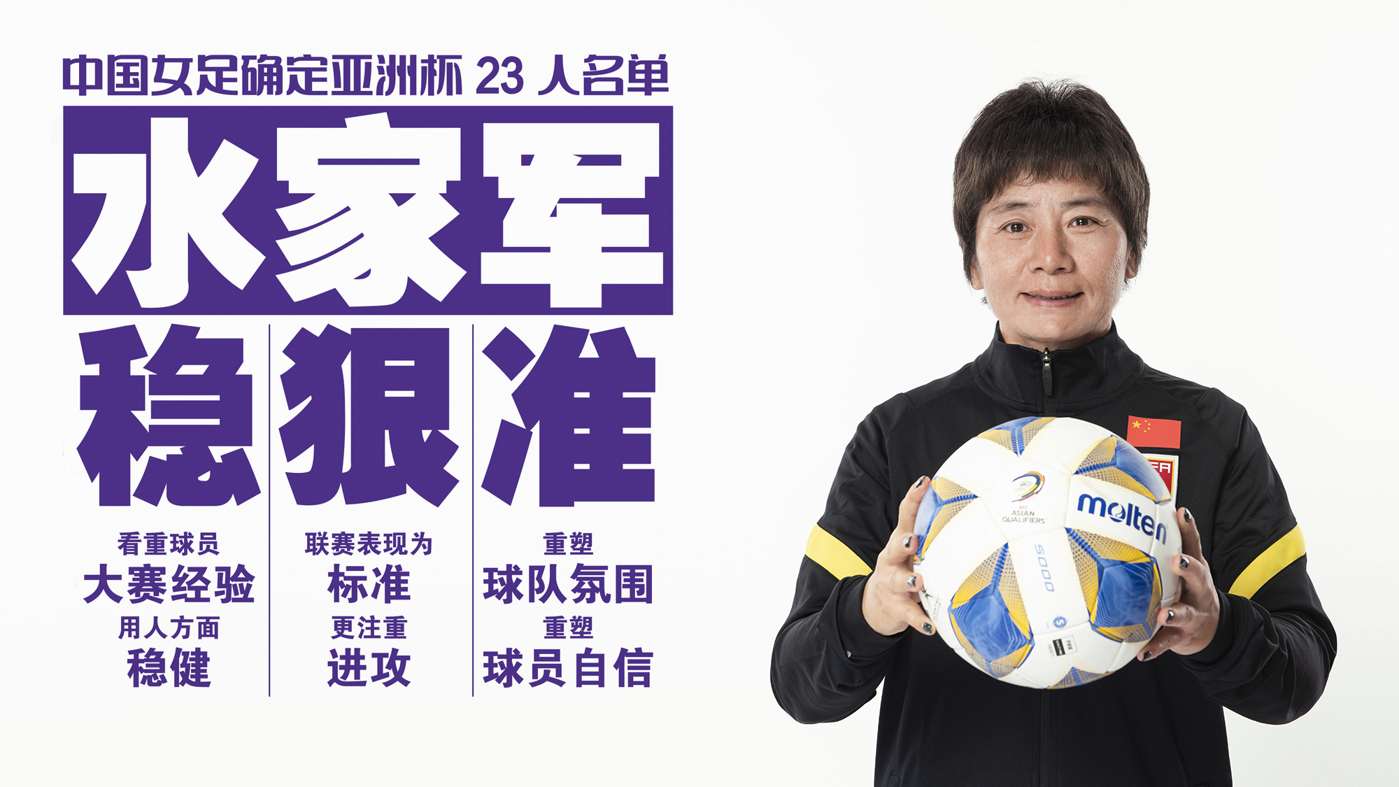 1月20日,第20届女足亚洲杯决赛阶段比赛将在印度打响,1月11日,中国女足公布了出征女足亚洲杯的23人名单,唐佳丽、马君、李佳悦、李影、张睿、赵丽娜、娄佳惠、刘艳秋等女足队员重新回归国家队阵容,她们将与王霜、王珊珊等女足队员一起向女足亚洲杯发起冲击。从水庆霞最终确定的23人名单来看,首次出征亚洲大赛的水家军看重队员们在女超联赛中的表现,随着一些经常入选国家队队员的回归,也证明水庆霞很注重队员的大赛经验,选择了更多成熟稳重的队员出征。