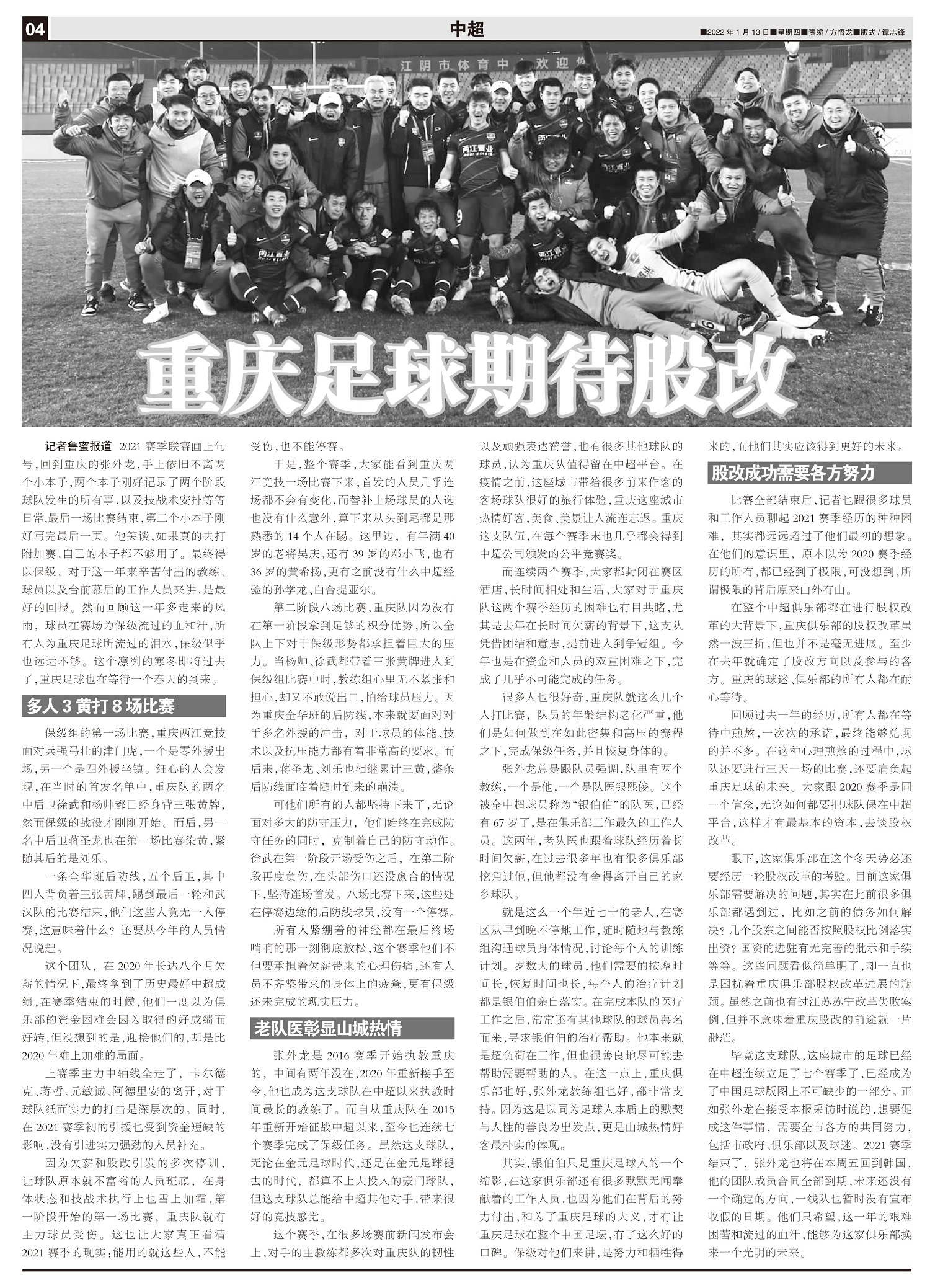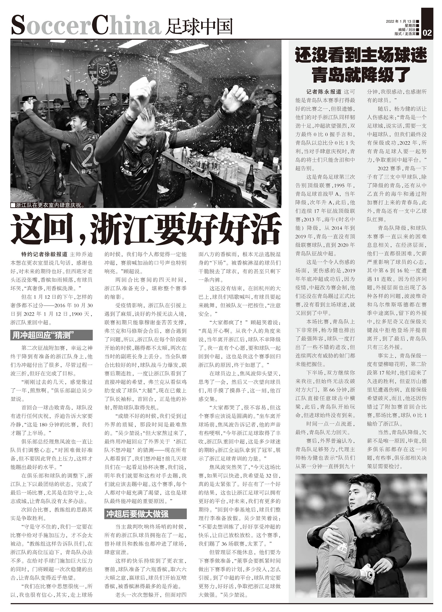 2022年1月12日,2021年度超甲附加赛第二回合比赛落幕,青岛队和浙江队打成0比0,成都蓉城1比...