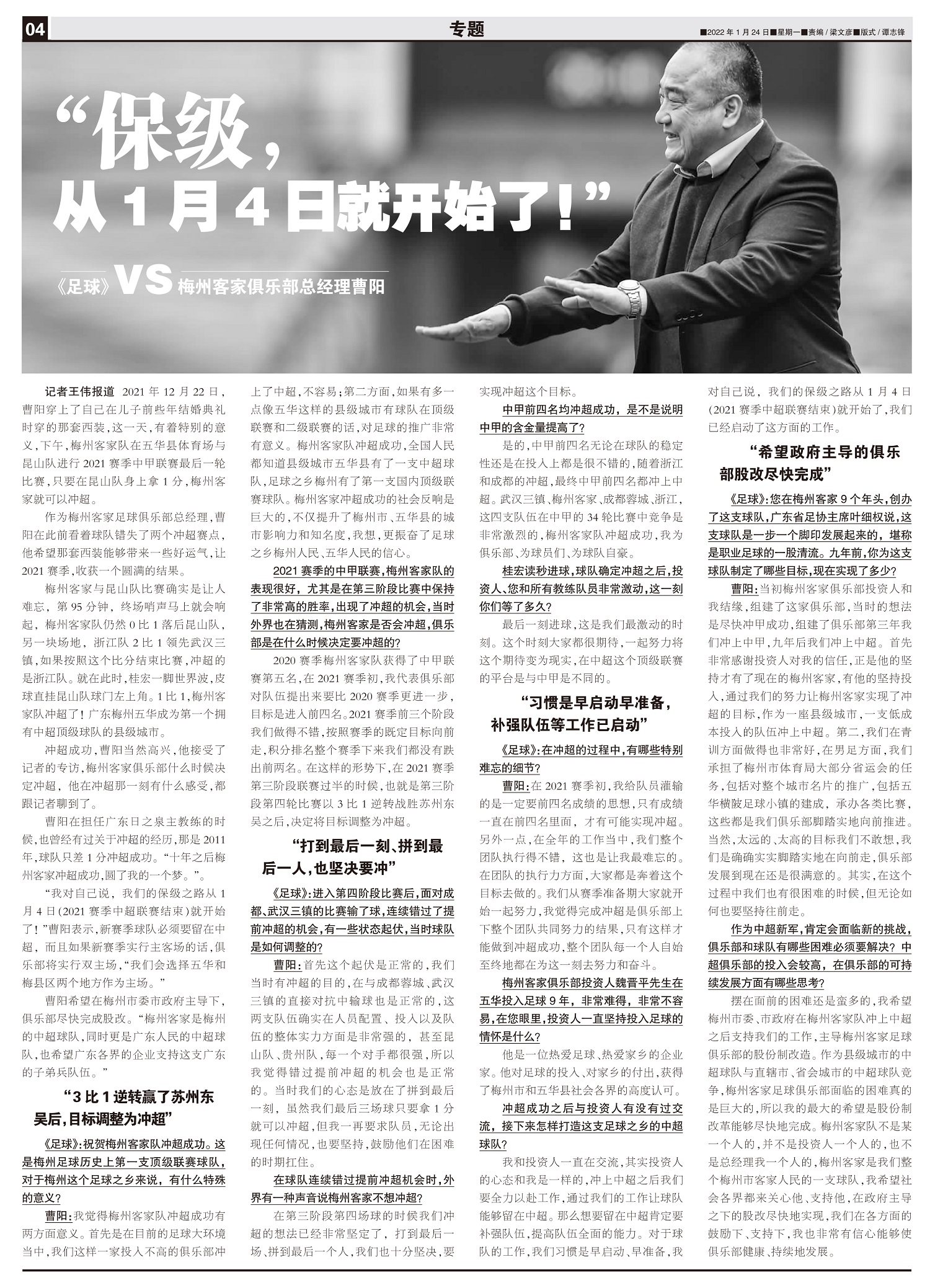 “保级,从1月4日就开始了 ” 《足球》 VS 梅州客家俱乐部总经理曹阳