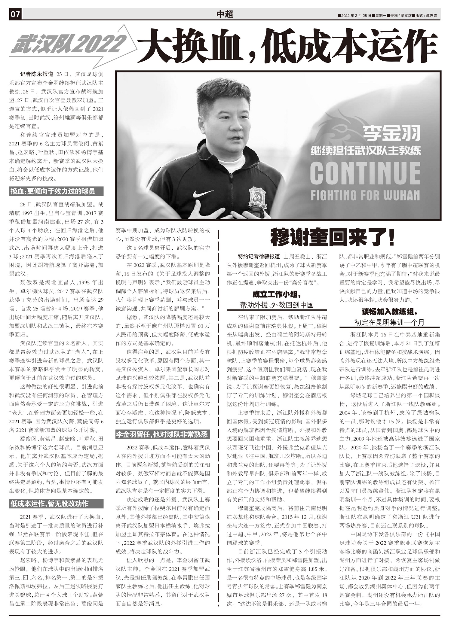 25日,武汉足球俱乐部官方宣布李金羽继续担任武汉队主教练,26日,武汉队官方宣布胡靖航加盟,27日,...