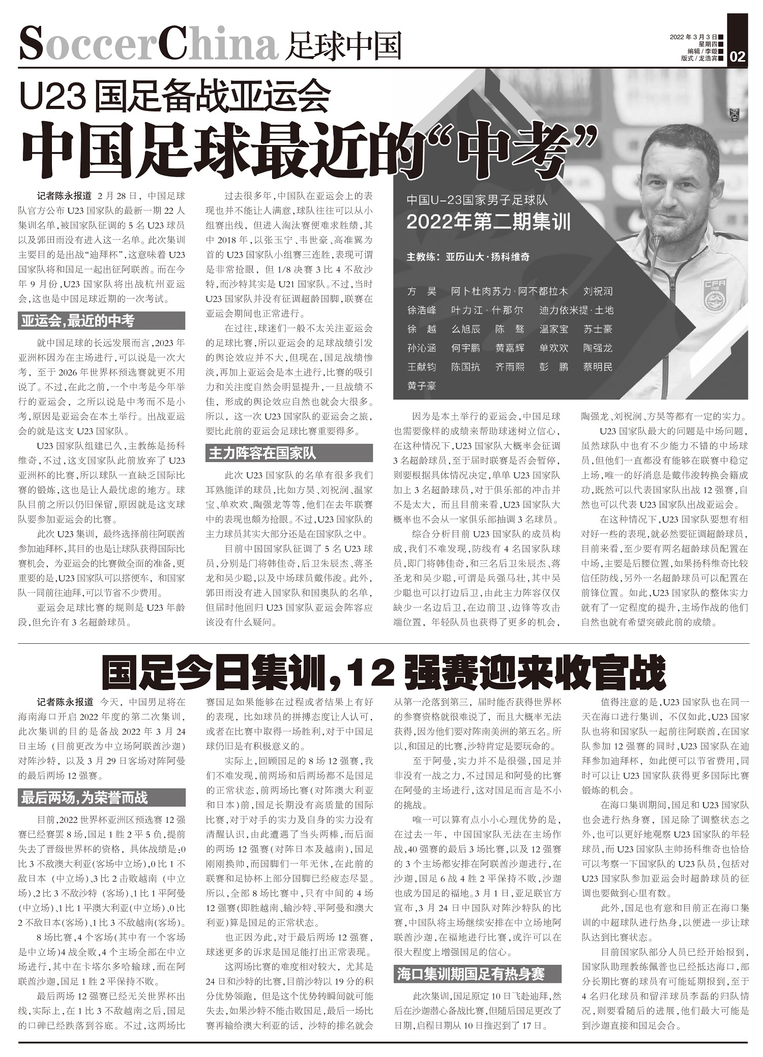 2月28日,中国足球队官方公布U23国家队的最新一期22人集训名单,被国家队征调的5名U23球员以及...