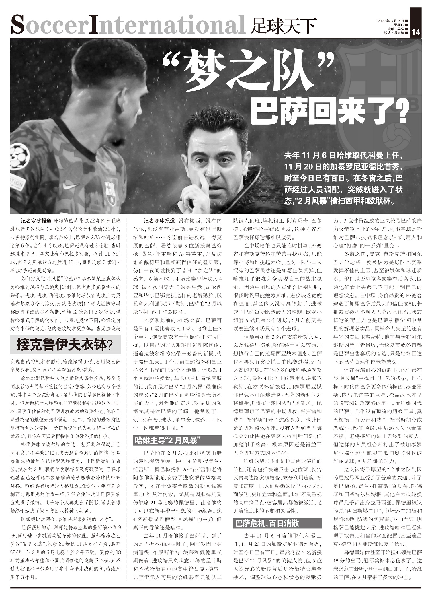 去年11月6日哈维取代科曼上任,11月20日的加泰罗尼亚德比首秀,时至今日已有百日。在冬窗之后,巴萨...