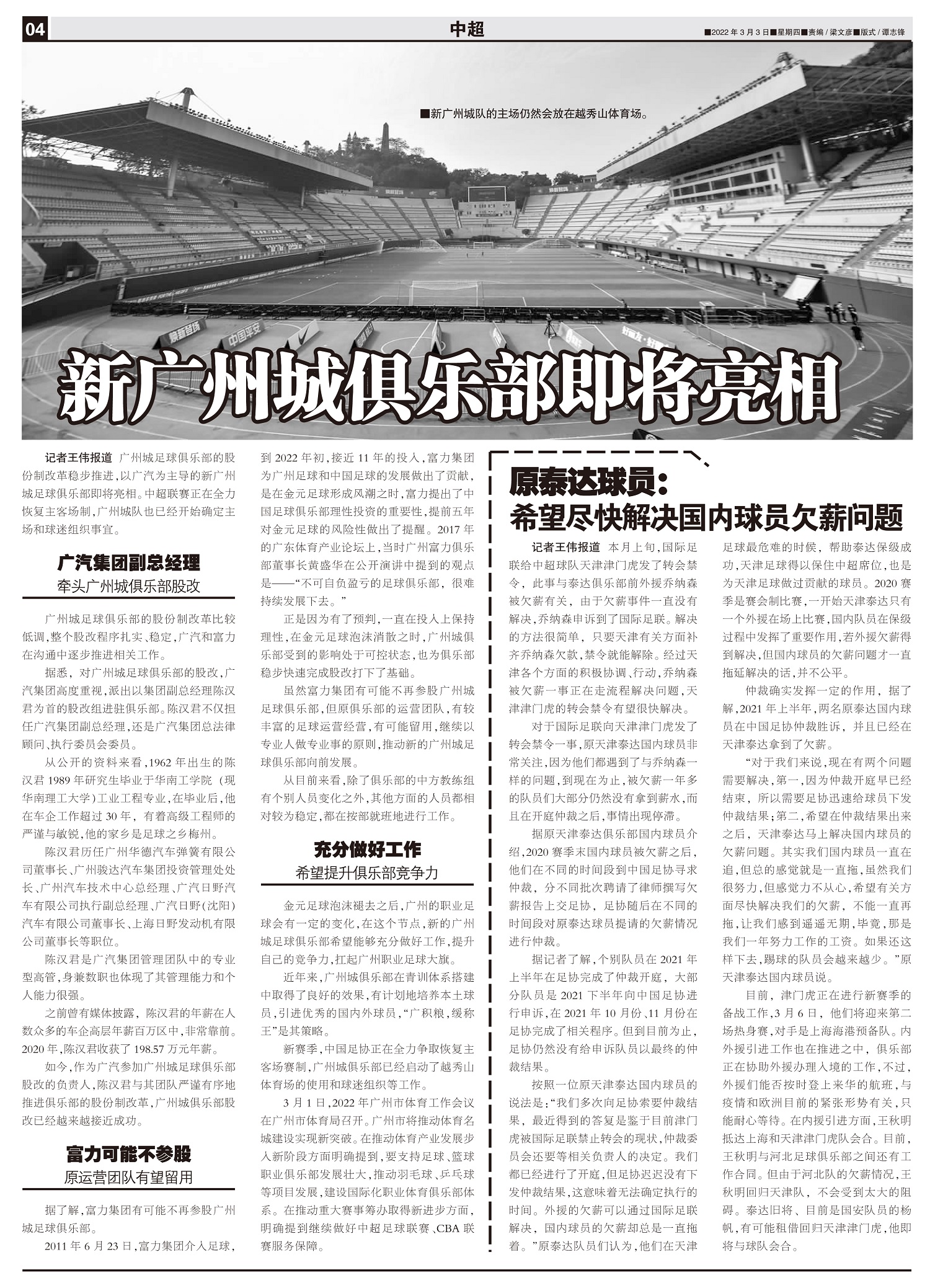 广州城足球俱乐部的股份制改革稳步推进,以广汽为主导的新广州城足球俱乐部即将亮相。中超联赛正在全力恢复...