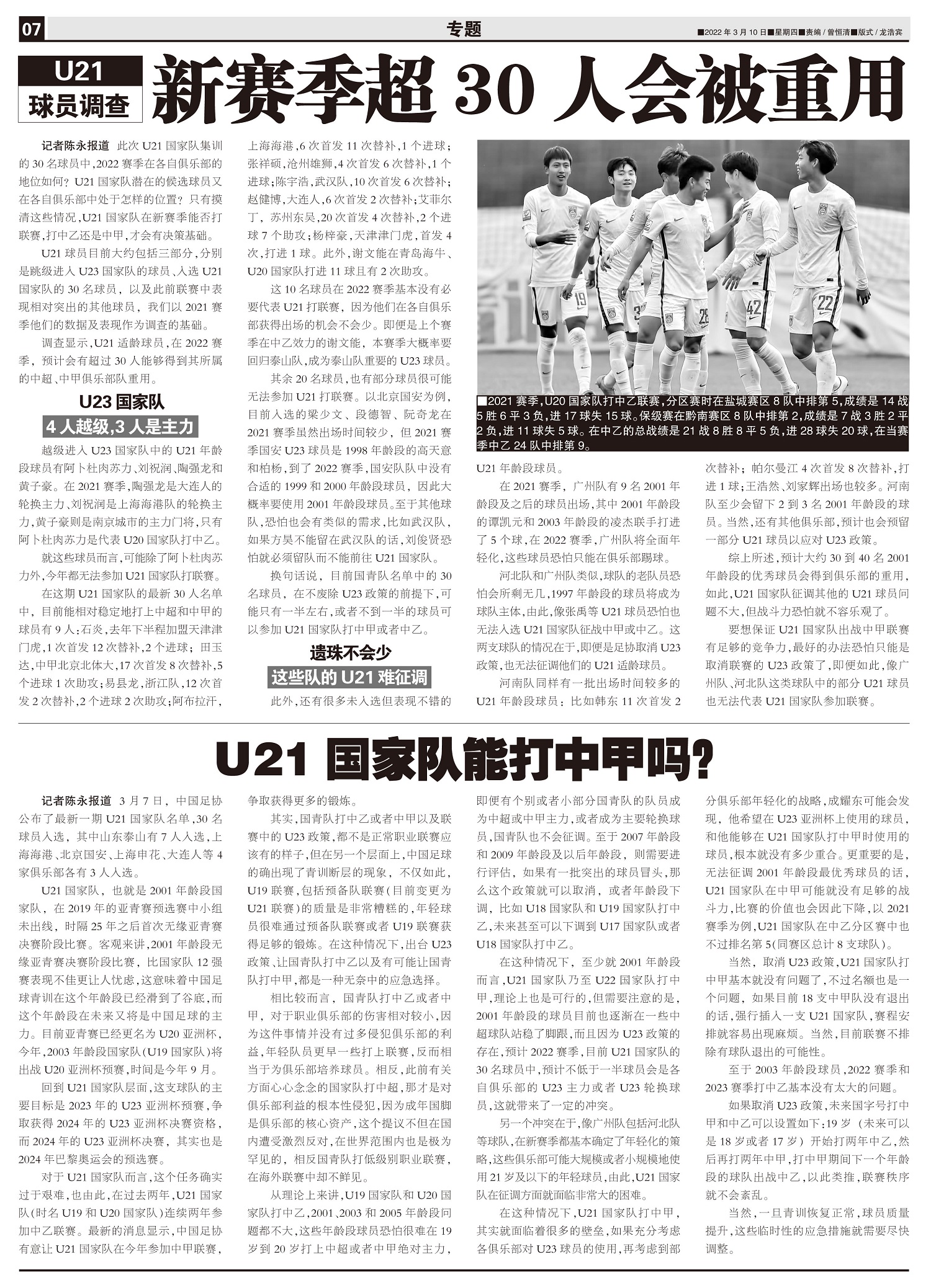 U21球员调查 新赛季超30人会被重用