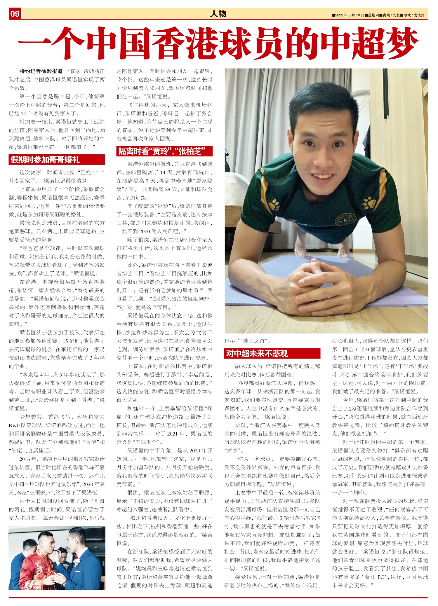 上赛季,帮助浙江队冲超后,中国香港球员梁诺恒实现了两个愿望。