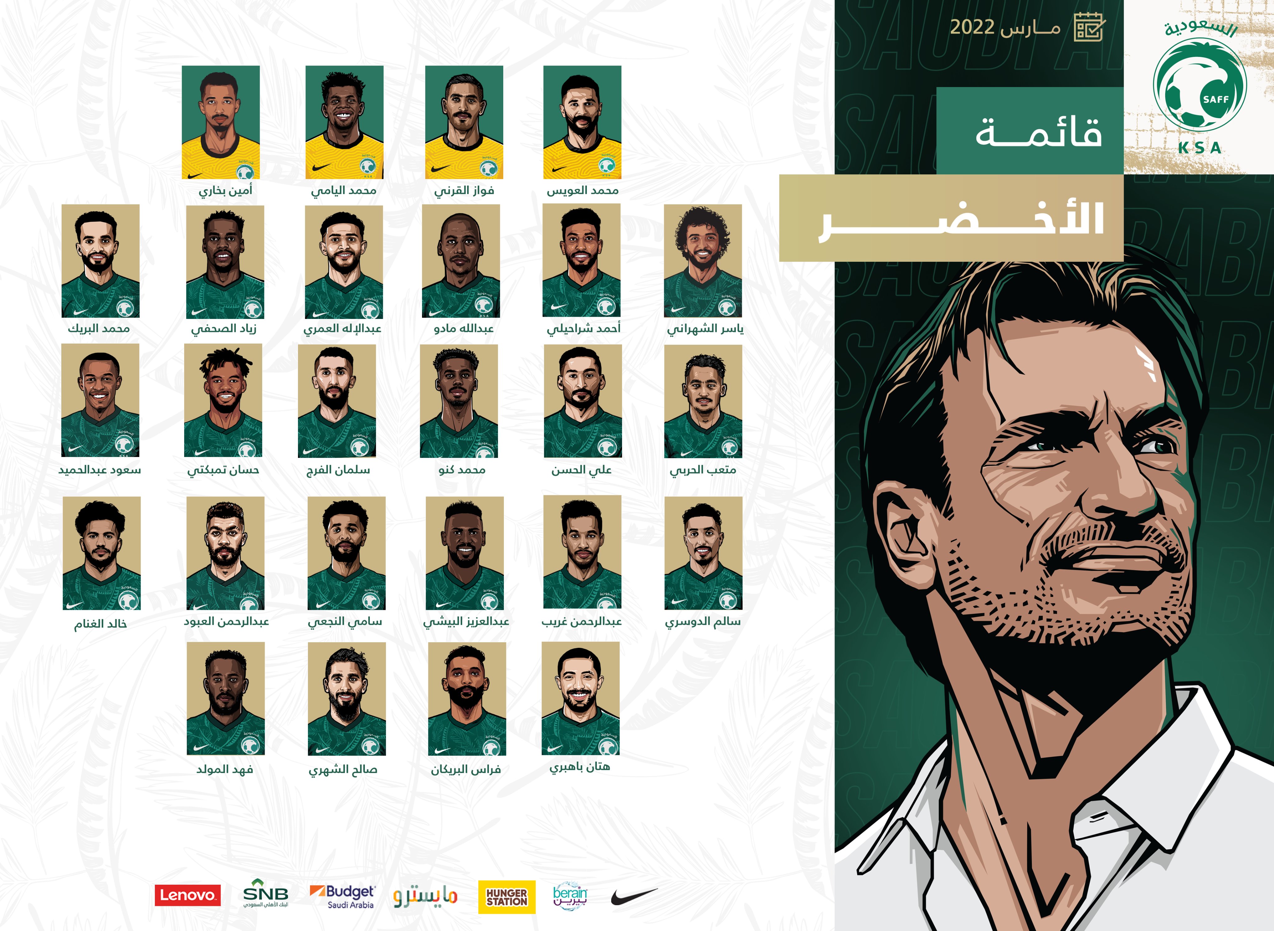 3月15日,沙特足协公布了3月12强赛的26人大名单,与1月的大名单相比替换了8人,涉及三条线,主帅海纳赫在谋求出线之外也有意考察新人。