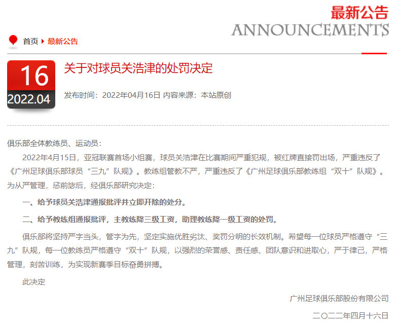 广州队在处罚通告中表示,球员关浩津在比赛期间严重犯规,被红牌直接罚出场,严重违反了《广州足球俱乐部球员“三九”队规》;教练组管教不严,严重违反了《广州足球俱乐部教练组“双十”队规》。经俱乐部研究决定:给予球员关浩津通报批评并立即开除的处分;给予教练组通报批评,主教练降三级工资、助理教练降一级工资的处罚。
