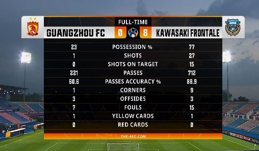 首战面对东道主柔佛都输足5球的广州青年军,此役迎战5年4夺国内冠军的J联赛新霸主川崎前锋,实力差距可想而知。即便这支日本豪门在本场首发阵容中轮换了除门将郑成龙外的全部球员,但开场仅仅21分钟,他们就取得4球的领先,上半场过后以5比0大比分领先;易边再战,川崎前锋的攻势依旧没有减弱,最终以8比0的悬殊比分横扫广州队。