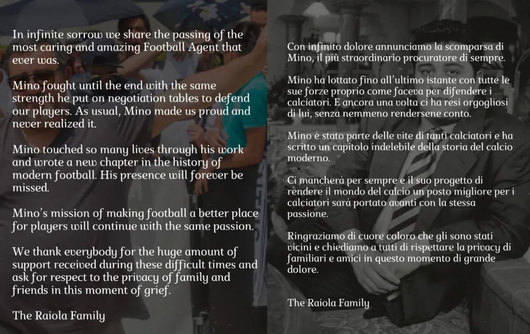 遗憾的是,曼城人的担忧不幸成真:拉伊奥拉的生命在周六还是走到了终点。4月30日,拉伊奥拉的律师受拉伊奥拉家族之托,正式宣布了这位超级经纪人去世的消息。