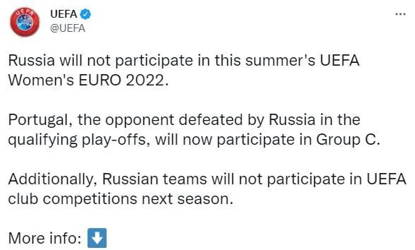 记者寒冰报道 2月28日国际足联和欧足联对俄罗斯足球实行“暂时性”禁赛后,5月2日欧足联正式对俄罗斯足球全面禁赛。即将开始的2022/23赛季,11人制和5人制俄罗斯各年龄组男女国家队和俱乐部,都将无缘所有欧足联旗下比赛。俄罗斯男足无缘6月的欧洲国家联赛,女足无缘7月的女足欧洲杯,名额由预选赛附加赛输给俄罗斯的葡萄牙女足顶替,同时俄女足还将无缘2023年女足世界杯预选赛。