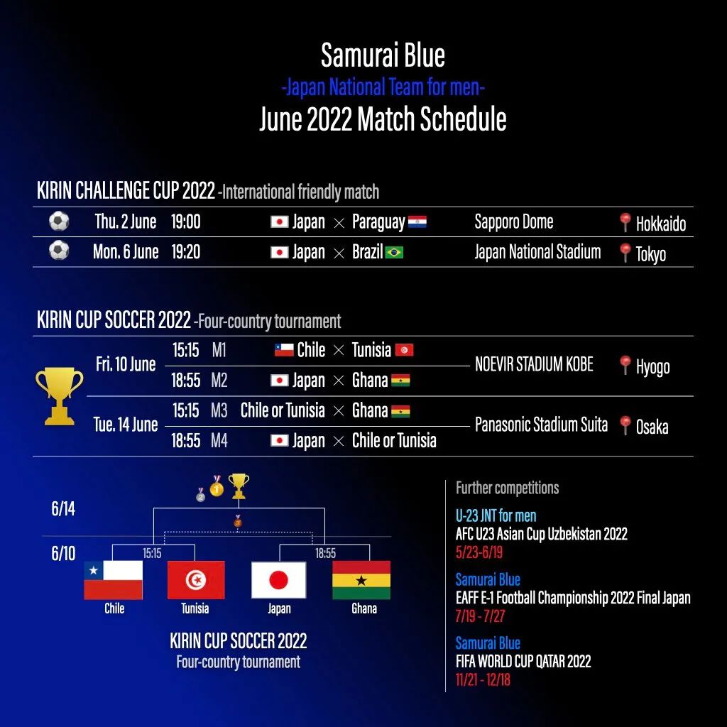 时隔6年,日本足协重启了有44年历史的麒麟杯,邀请了南美洲的智利、非洲的加纳和突尼斯参赛,比赛采取单场淘汰制,其中,6月10日日本队与加纳交手,14日与智利或突尼斯对阵。而在6月2日和6日,日本足协安排的是同为麒麟集团赞助的麒麟挑战杯,后者始创于2013年,2020年因新冠疫情停办,2021年因对手牙买加无法满足日本入境防疫检测要求,临时改为日本U24代表队和塞尔维亚参赛。