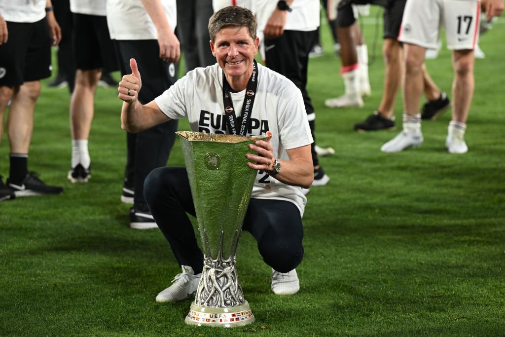欧联决赛已经结束了好一会,塞维利亚的午夜已经过去,法兰克福主帅格拉斯纳重新召唤球员们排成一列,进行最后一轮庆祝。这位平时安静内向的奥地利人带头来了一个草坪上的俯冲滑翔,只有刚刚拿到的欧联杯冠军奖牌,可以让他释放情绪,做出如此狂野的庆祝动作,而球员们纷纷跟在他的身后做出同样的动作。