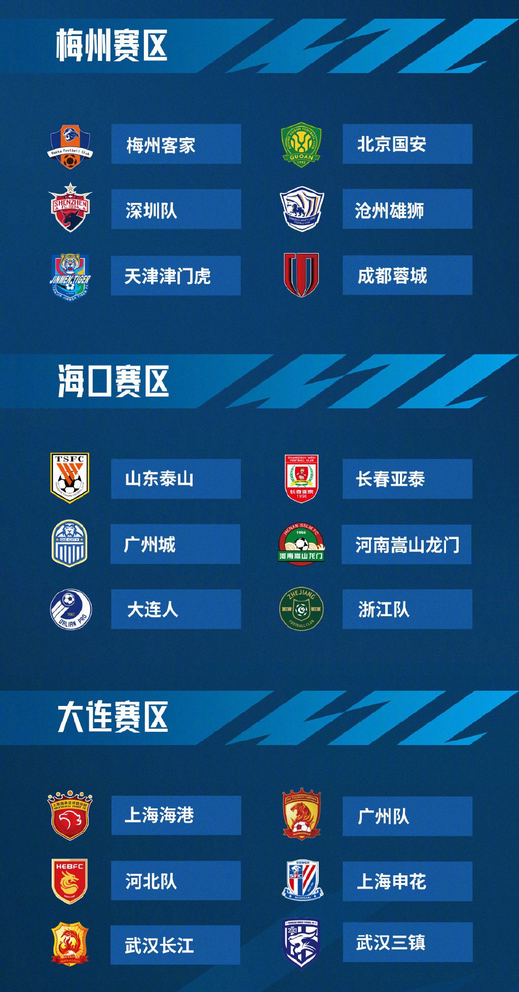 随着大连人递补进入中超,中超联赛三个赛区的参赛球队也已经敲定。