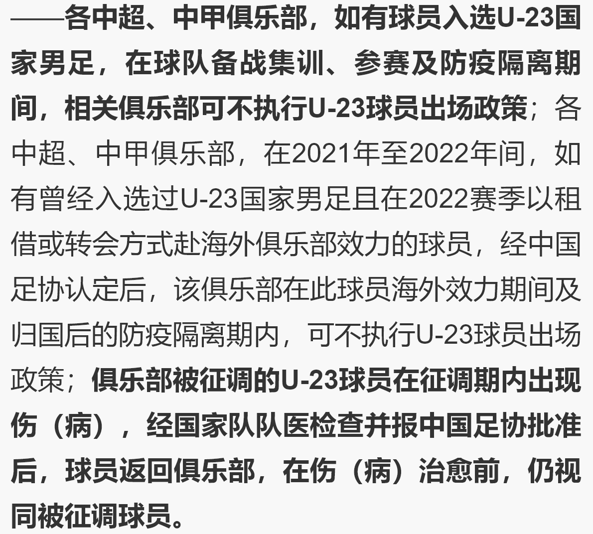 而中国足协对于U23减免政策的规定,其实可以再细致一些,结合这次出现的问题,应该稍微明确规定,就是球员在开赛前如果伤势仍旧未好,该怎么认定是不是属于减免。
