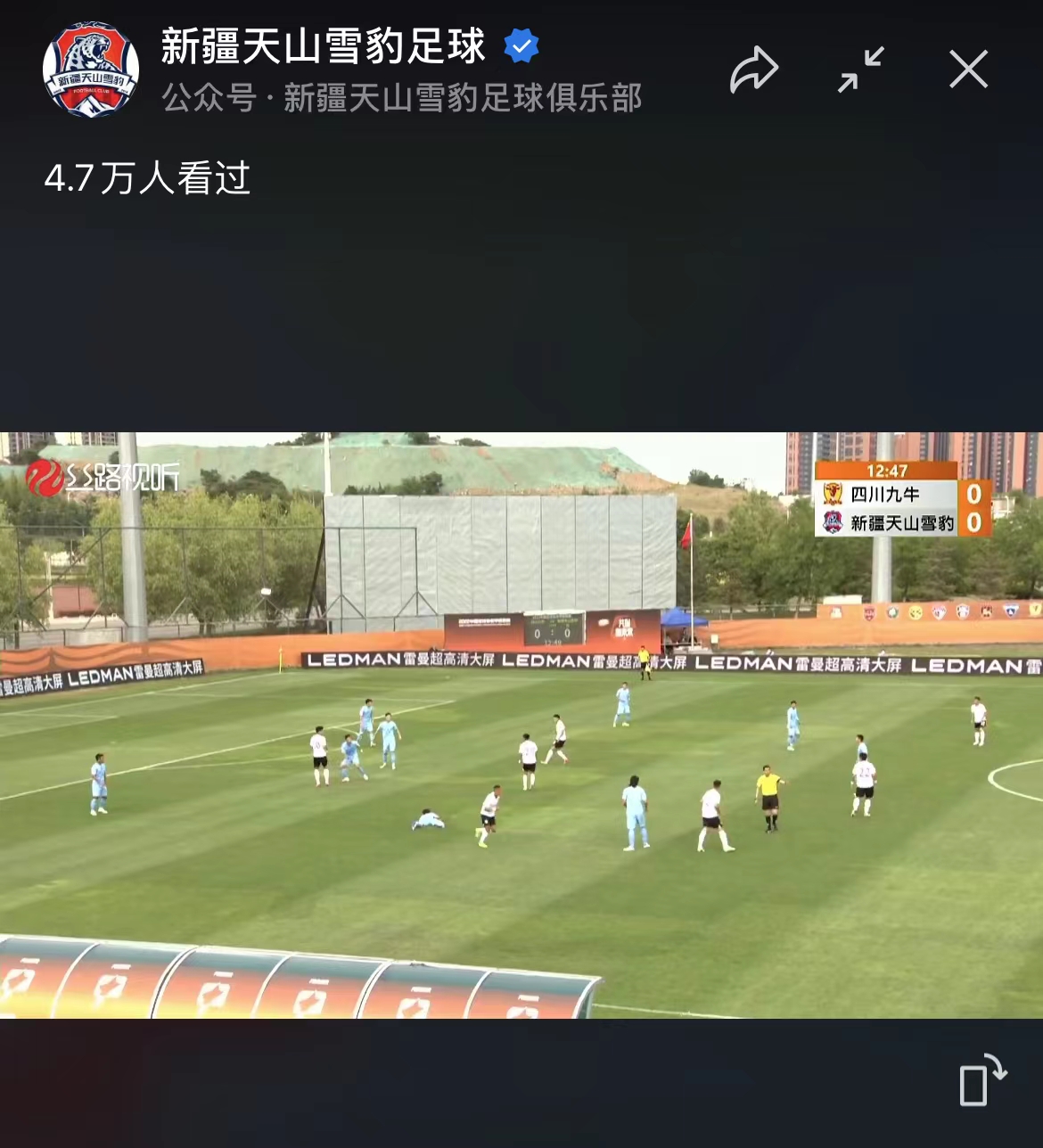 在首轮中甲开始前两天,天山雪豹就通过公众号对外宣布了将在自家视频号上进行付费直播的消息。虽然最后比赛以失利告终,但还是有不少新疆天山雪豹的球迷首次通过视频号的直播,观看了球队的比赛,以特殊的方式表达了对球队的支持。