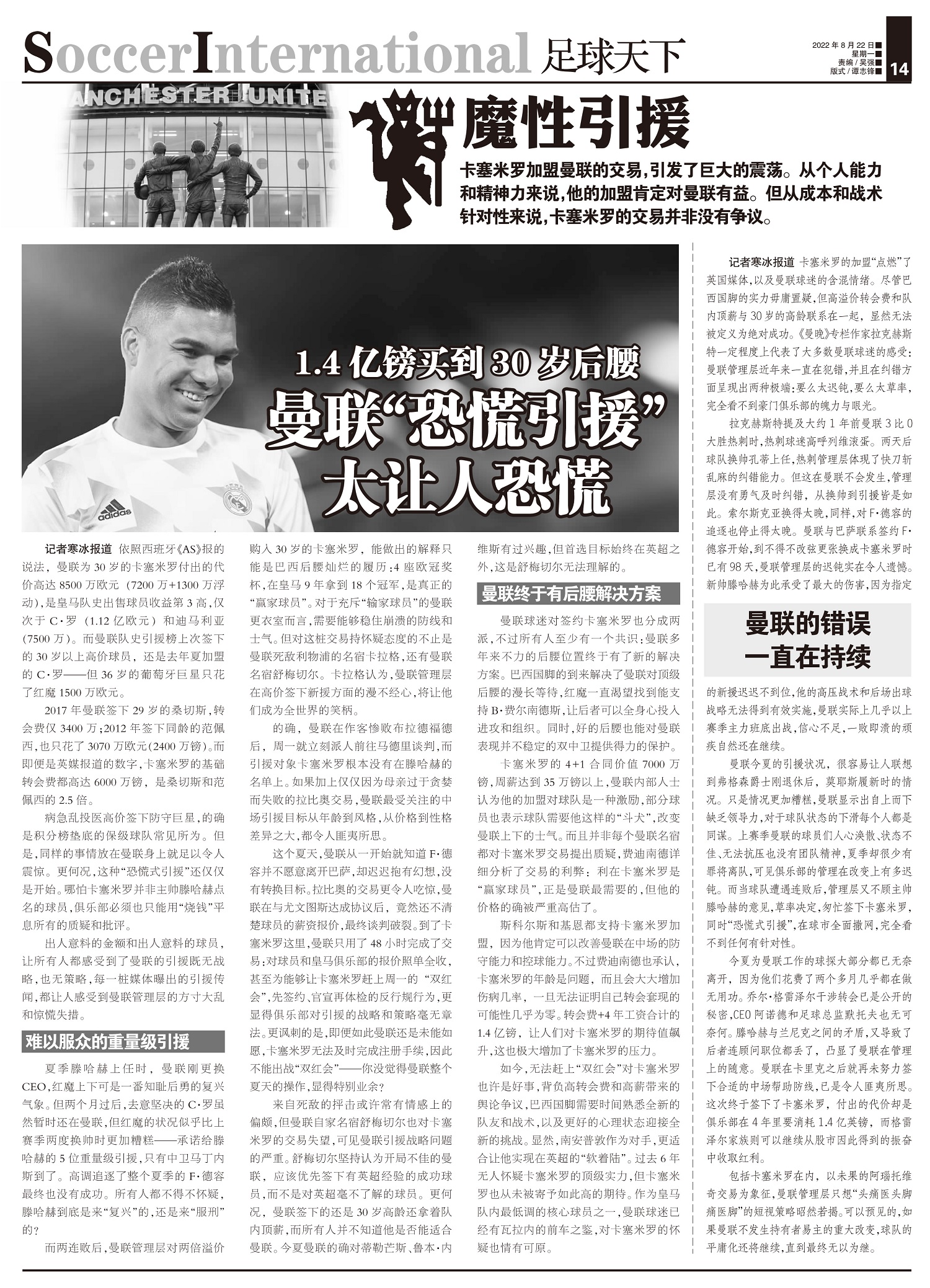 卡塞米罗的加盟“点燃”了英国媒体,以及曼联球迷的含混情绪。尽管巴西国脚的实力毋庸置疑,但高溢价转会费...