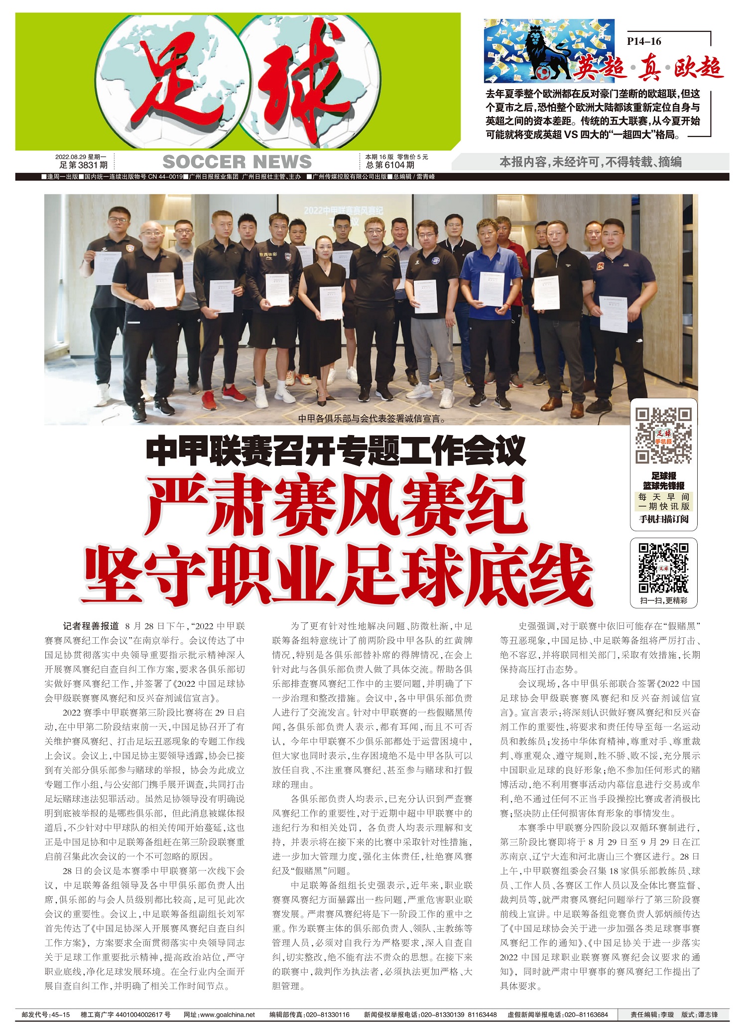 8月28日下午,“2022中甲联赛赛风赛纪工作会议”在南京举行。会议传达了中国足协贯彻落实中央领导重...