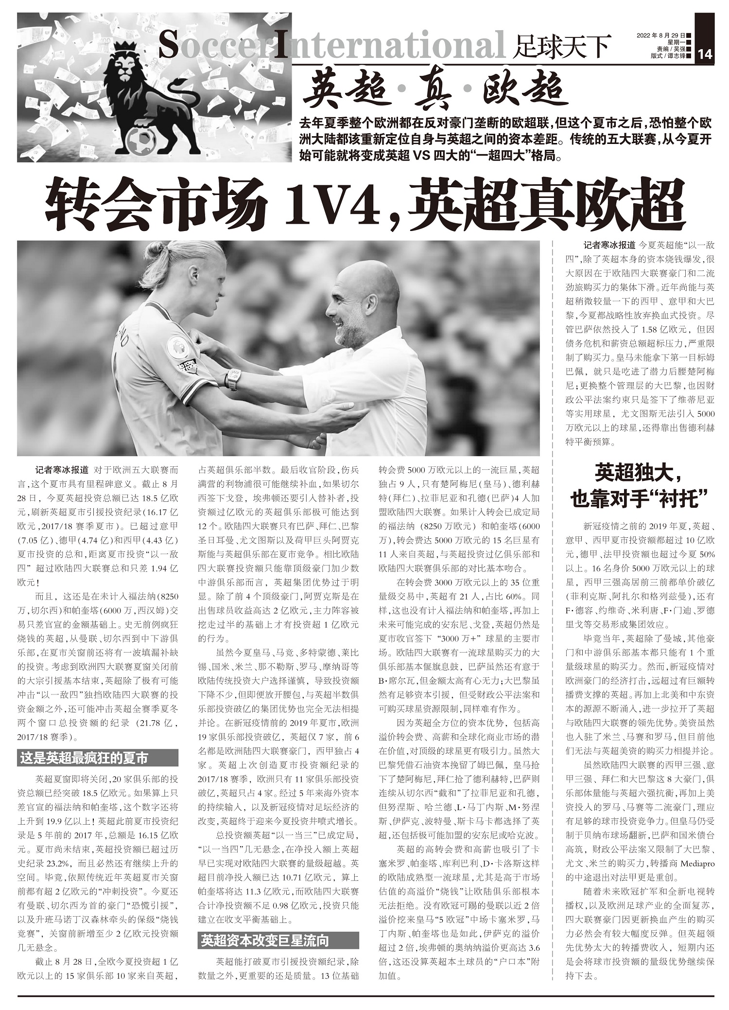 英超·真·欧超5家英超中下游俱乐部的投资额就超过了意甲(7.05亿),以及其他欧陆三大联赛。英超的投...